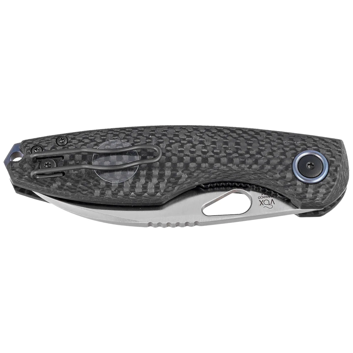 Rękojeść - okładziny z Carbon Fiber (włókno węglowe prasowane pod ciśnieniem z żywicą syntetyczną) o pięknym i niepowtarzalnym wzorze. Fazowane krawędzie okładek eliminują ostre krawędzie dla wygody chwytu. Anodyzowany na niebiesko tytanowy backspacer zapewnia sztywność i solidność całej konstrukcji. Dwupozycyjny (prawa/lewa) lekki klips z drutu (wire clip) umożliwia przenoszenie noża w pozycji tip-up, czubkiem ostrza ku górze. Oś pivota ozdobiona anodyzowaną na niebiesko tytanową obręczą (pivot collar cap). Nad klipsem otwór do przewleczenia linki zabezpieczającej lub ozdobnej.