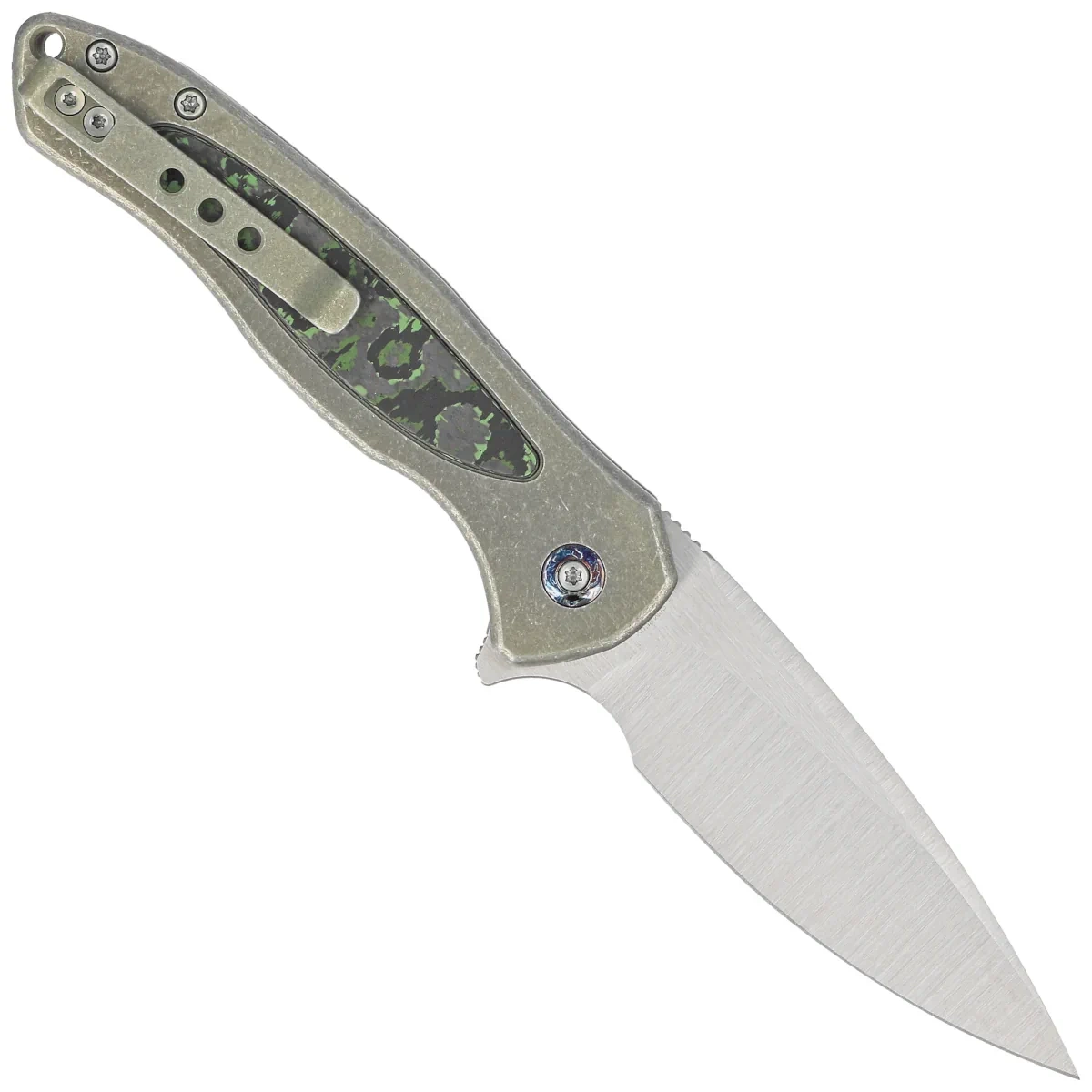 Nóż składany WE Knife Button Lock Kitefin LE No 103/157 Green Titanium/Jungle Wear Fat Carbon, Hand Polished Satin CPM 20CV (WE19002N-2)