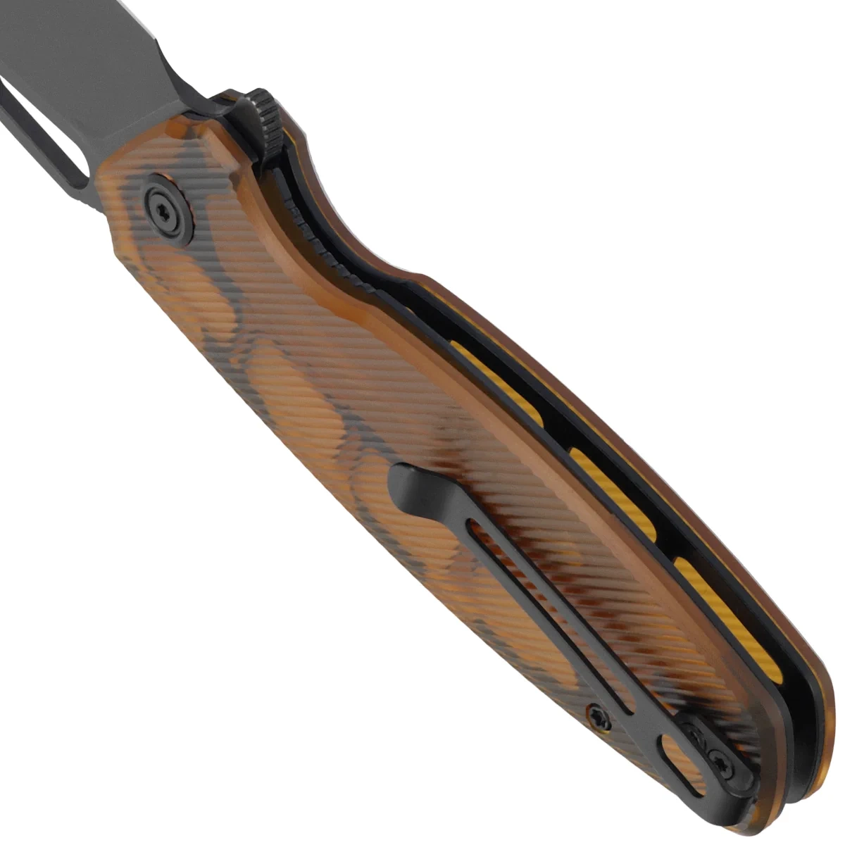 Głownia - typu drop point, z szeroką klingą wykończona maskującą rysy metodą Stonewashed a następnie pokryta czarną powłoką. Długa krawędź tnąca w stosunku do długości głowni zbiega się w kierunku ostrego jak igła czubka noża. Grubość klingi zapewnia wysoką wytrzymałość podczas gdy wysoki, płaski szlif daje doskonałą geometrię krawędzi tnącej oraz ekstremalną wydajność cięcia. Ceramiczne łożyska kulkowe odpowiadają za płynną i gładką pracę mechanizmu otwierającego nóż. Płetwa flippera po otwarciu tworzy mini-gardę zapobiegając ześlizgnięciu się dłoni na ostrze. Nóż można również otworzyć przy pomocy otworu wyfrezowanego w klindze. Na grzbiecie klingi upper jimping, karbowane oparcie pod kciuk. Mechanizm blokady Liner-Lock.