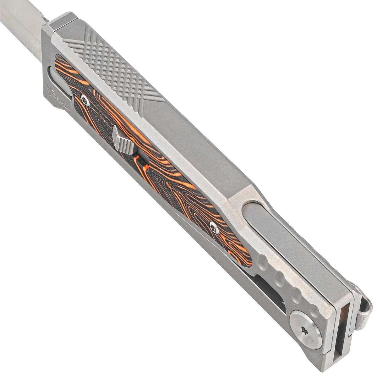 • EXO M OTF Gravity Double Edge Bead Blasted Titanium / Damascus Orange-Black G10, Satin. Pomysłowy nóż z legendarnej manufaktury Reate Knives. OTF z wysuwanym dzięki sile grawitacji ostrzem z Elmaxu. Najlepsze materiały, intuicyjne otwieranie.