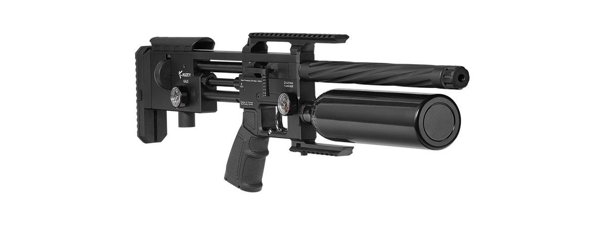 • Kuzey Gale - nowoczesny, wielostrzałowy karabin PCP ze zintegrowanym tłumikiem, o pojemnym kartuszu 425cc. Bezkolbowa osada (bullpup) z aluminium z regulowaną baką policzkową i stopką. Wiatrówka w kalibrach 4.5, 5.5, 6.35 mm