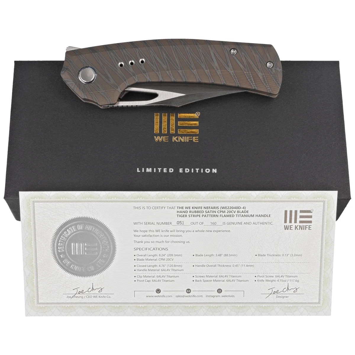 - Nefaris Tiger Stripe Titanium, Hand Rubbed Satin LE. Limitowana edycja WeKnife ograniczona do 160 szt eleganckiego noża EDC o numerze 051. Perfekcyjne wykonany z wykończeniem rękojeści z litego tytanu oraz głowni ze stali CPM 20CV