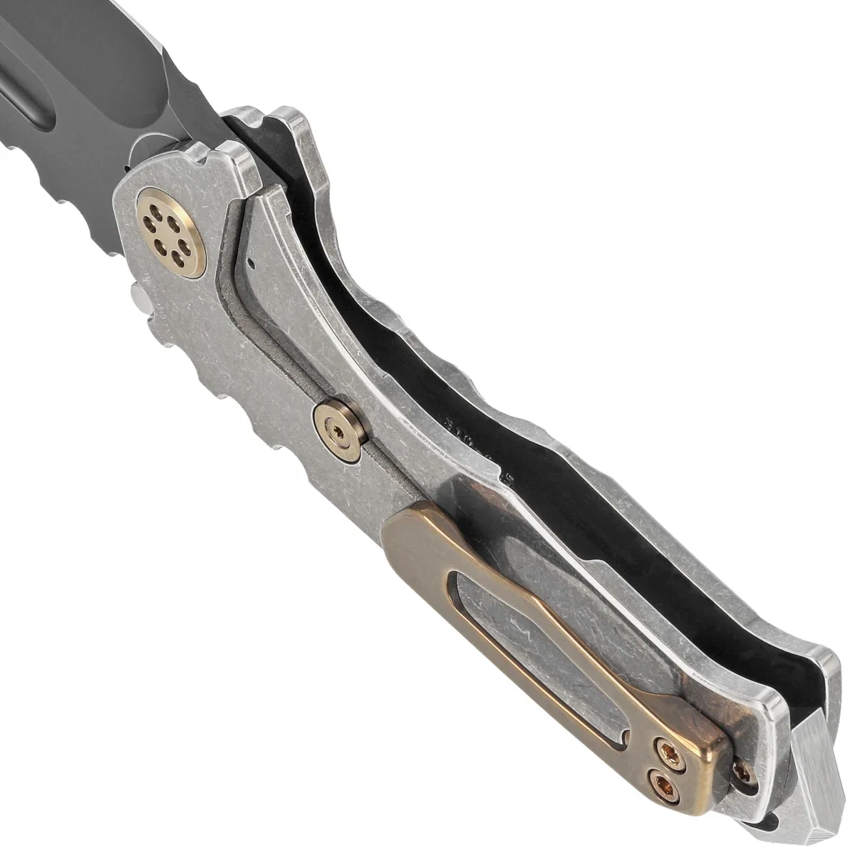 Rękojeść - z LITEGO tytanu wykończonego maszynowo "tumbled". Wszystkie warianty Praetoriana są wyposażone w backspacer ze stali hartowanej D2, pokrytej powłoką NP3 który jest jednocześnie zbijakiem do szkła. MKT dokładnie przetestowała te backspacery i przekonała się, że są całkowicie niezawodne i w 100% funkcjonalne. Żadnych sztuczek. Nie będzie innych wariantów tego backspacera, w innym materiale lub kształcie, ponieważ ma on służyć ratowaniu życia w nagłych wypadkach, a nie dla ozdoby. Podczas testowania należy nosić ochronę dłoni i ramion, ponieważ nadmierny siła uderzenia ZAWSZE spowoduje skaleczenia! Całości dopełnia masywny, klips, oczywiście również z tytanu anodyzowanego na brąz.