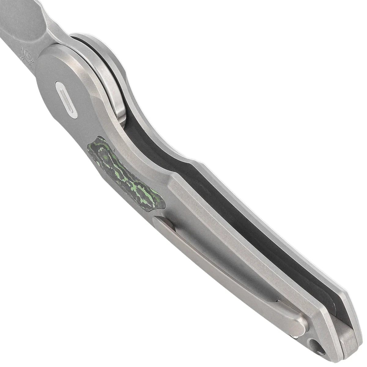 Rękojeść - to grube kawałki szkiełkowanego tytanu 6AL4V, pięknie frezowane przy pomocy obrabiarek CNC. Po obu stronach znajduje się inlay (wkładka) wykonana z Jungle Wear Fatcarbon. Masywny backspacer z piaskowanego tytanu nadaje całej konstrukcji pożądanej sztywności. Prostota i solidność budowy dają pewność wieloletniego użytkowania. Klips jednopozycyjny (prawa), wykonany z tytanu, umożliwia przenoszenie noża w pozycji tip-up. Nad klipsem lanyard hole, otwór do przewleczenia linki ozdobnej lub zabezpieczającej.