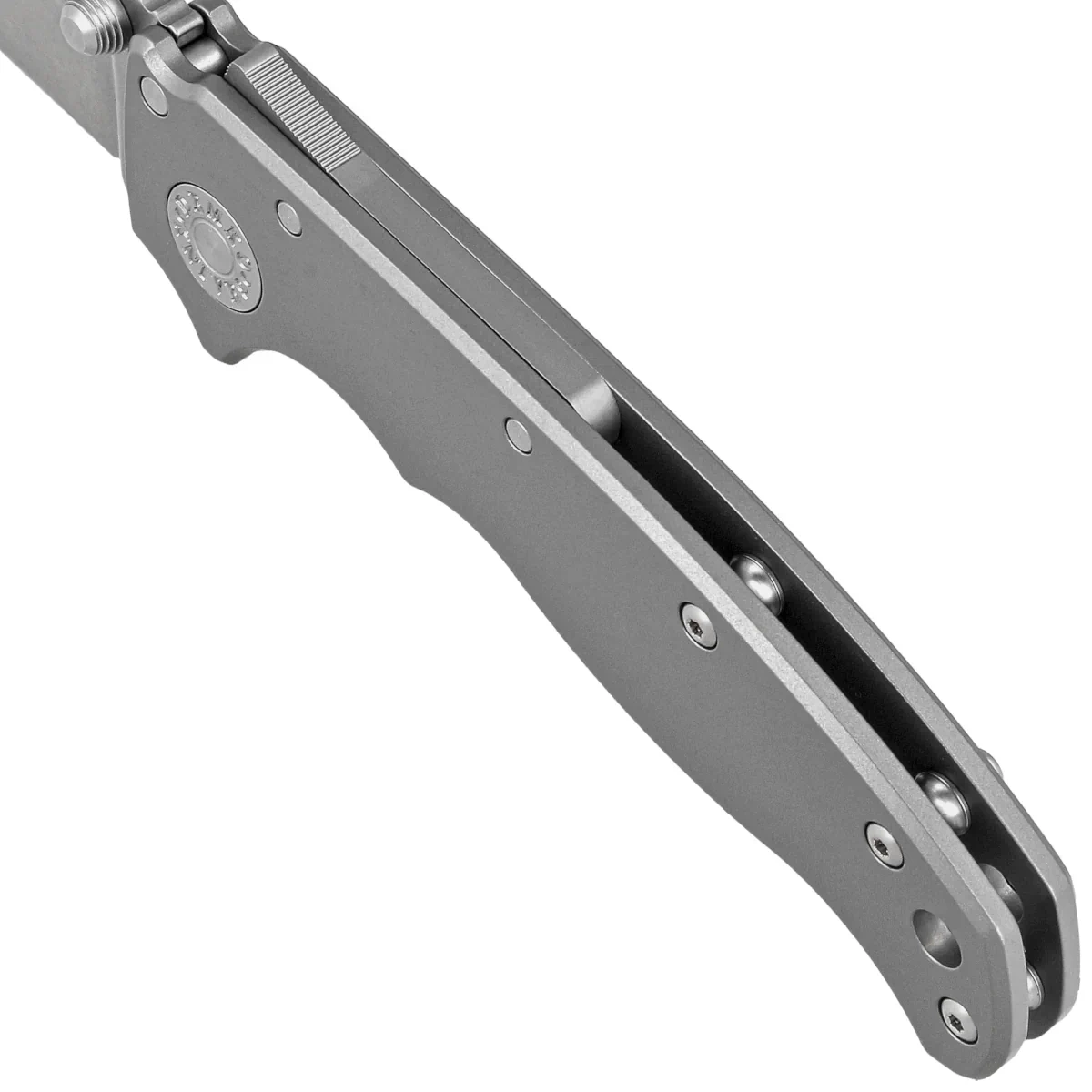 Rękojeść - wykonana z tytanu 6AL4V o lekko szorstkiej fakturze, którego fazowane krawędzie okładek eliminują ostre krawędzie dla wygody, a wykonane z przodu podcięcie na palec (fore finger groove) poprawia pewność uchwytu. Jednopozycyjny, prawostronny klips umożliwia przenoszenie noża w pozycji tip-up, czubkiem ostrza ku górze. W zestawie dodawany jest klips dla leworęcznych.