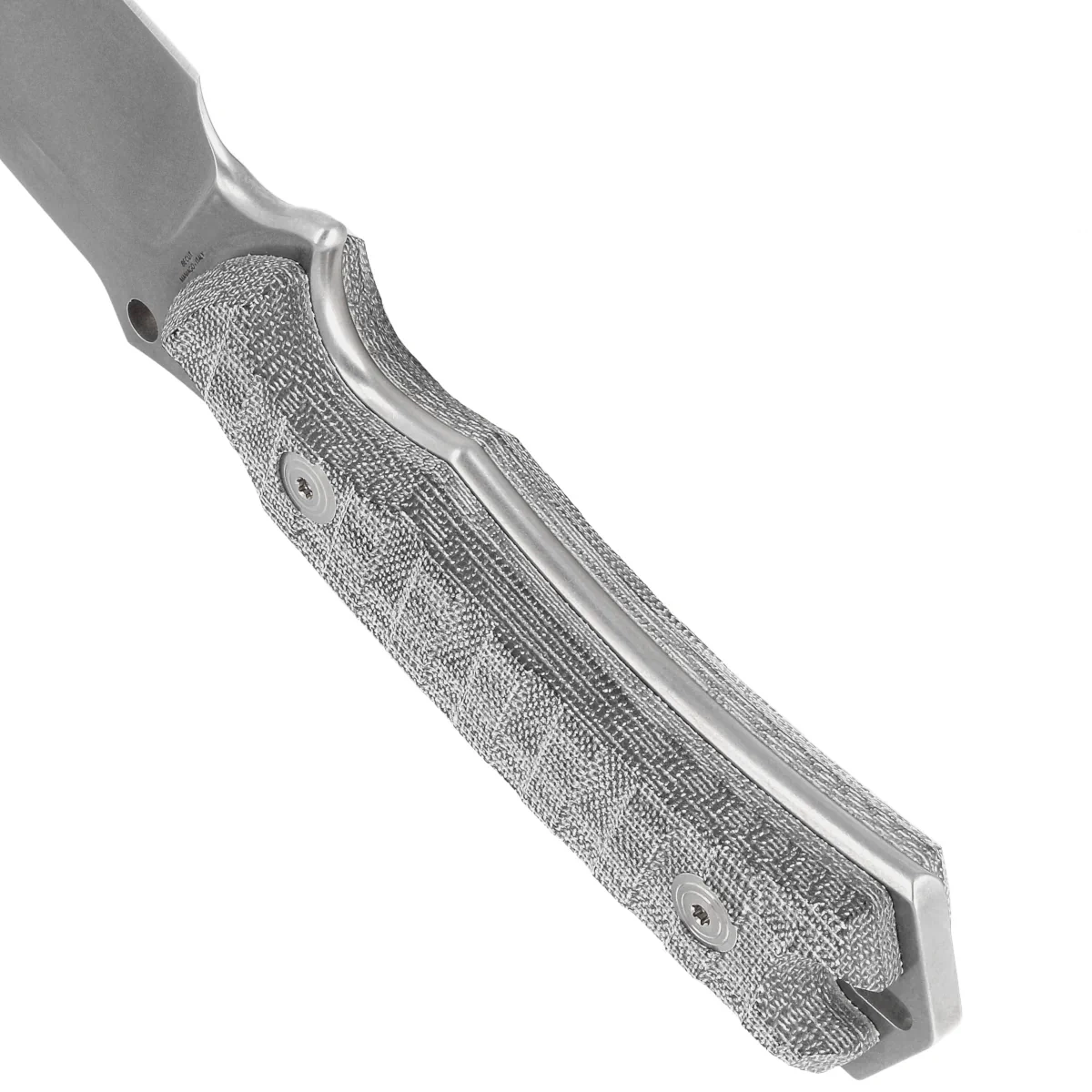 Rękojeść - profilowane okładziny z Micarty, praktycznie niezniszczalnego tworzywa niewrażliwego na warunki atmosferyczne, odpornego na chemikalia i uszkodzenia mechaniczne. Fazowane krawędzie okładek eliminują ostre ranty a teksturowanie i faktura powierzchni poprawia pewność uchwytu. Okładki chwytu przymocowano do trzpienia śrubami Torx. Fore Finger Groove, głębokie pocięcie pod palec zapobiega przypadkowemu ześlizgnięciu się ręki na ostrze. W tylnej części wystający fragment tanga może służyć za improwizowany młotek lub zbijak do szyb. Służy również do krzesania iskier z krzesiwa magnezowego.