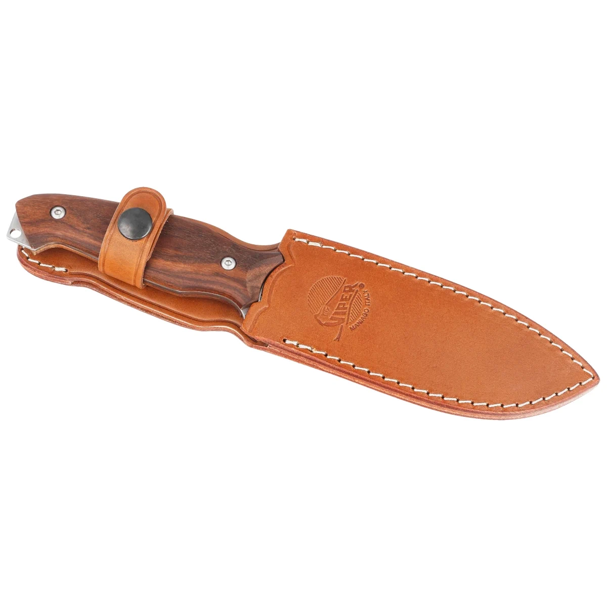 Pochwa - chroniąca głownię wraz z częścią rękojeści. Ręcznie szyta, wykonana z naturalnej skóry w brązowym kolorze z tłoczonym logo producenta. Brzeg etui przeszyto ozdobną nicią. Mocowana na pas umożliwia przenoszenie noża w pozycji pionowej.