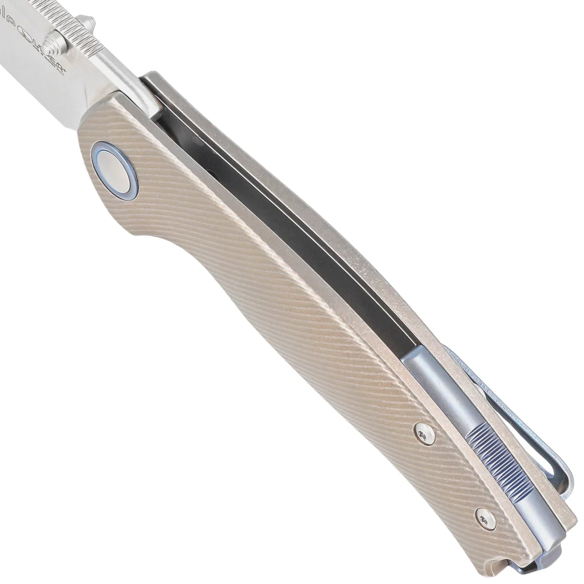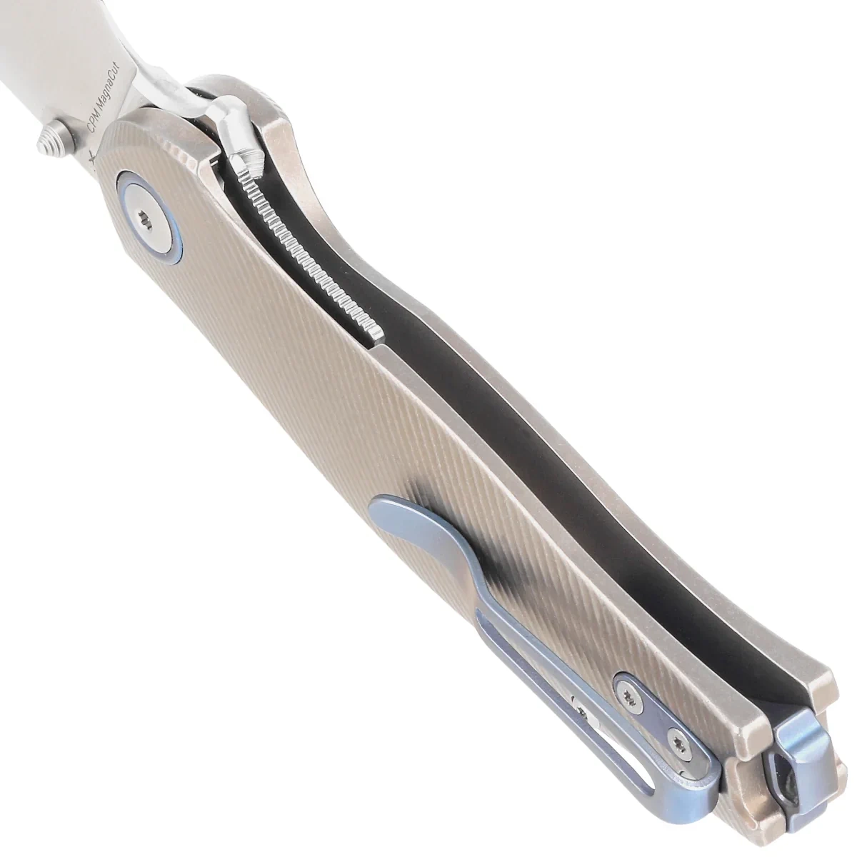 Rękojeść - okładziny z piaskowanego tytanu, kunsztownie frezowane, aby uzyskać fakturę na rękojeści. Połączone ze sobą przy pomocy frezowanego obrabiarkami CNC backspacera, dzięki czemu nóż zachowuje pożądaną sztywność konstrukcji. Backspacer oraz ozdobny pierścień wokół pivota tzw. pivot collar wykonano z tytanu anodyzowanego na niebiesko. Wykonane z przodu podcięcie na palce (fore finger groove) poprawia pewność uchwytu, tworząc jednocześnie z flipperem gardę zapobiegającą ześlizgnięciu się dłoni na ostrze. Prawostronny, jednopozycyjny tytanowy klips deep carry, pozwala przenosić dyskretnie nóż w pozycji tip-up (czubkiem do góry). Na końcu rękojeści lanyard hole, otwór na linkę.