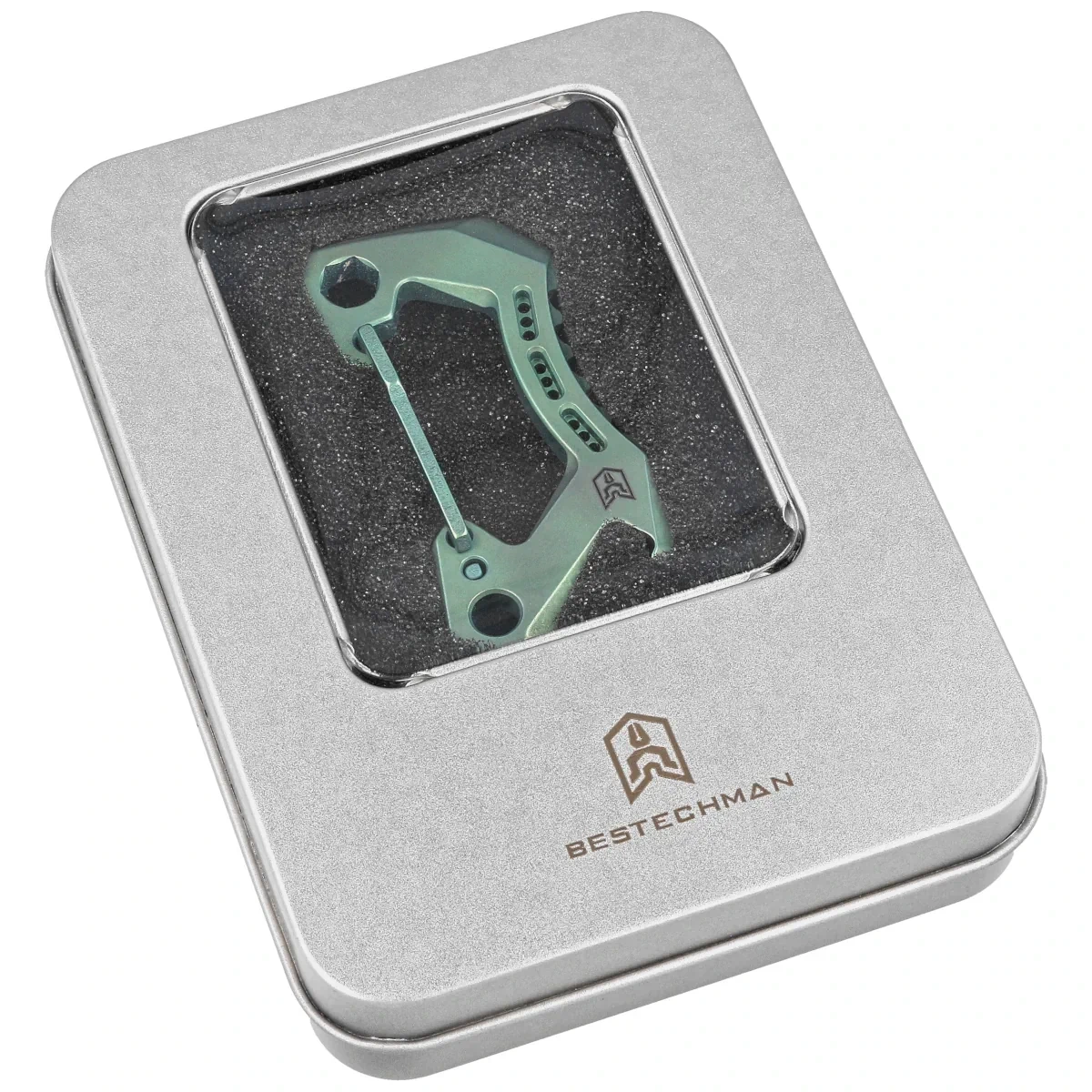• Bestech Carabiner Green Titanium wykonany z litego niemagnetycznego tytanu karabinczyk o wszechstronnym zastosowaniu. Zawiera otwieracz do butelek i klucz hex mogący służyć jako obsada do bitów. Uniwersalne akcesorium na co dzień!