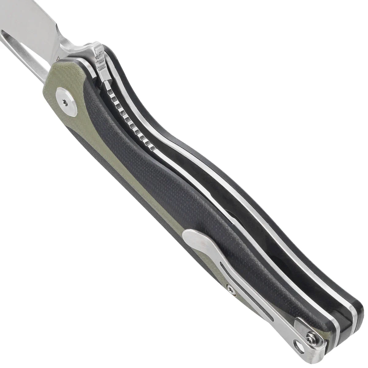 Rękojeść - okładziny z G10, praktycznie niezniszczalnego tworzywa niewrażliwego na warunki atmosferyczne, odpornego na chemikalia i uszkodzenia mechaniczne Fazowane krawędzie okładek eliminują ostre ranty a charakterystyczne teksturowanie powierzchni poprawia pewność uchwytu. Przykręcone do solidnego backspacera zapewniającego pożądaną sztywność całości. Prosta, solidna konstrukcja daje pewność wieloletniego użytkowania. Jednopozycyjnyprawostronny klips umożliwia przenoszenie noża w pozycji tip-up, czubkiem ostrza ku górze. Nad klipsem otwór do przewleczenia linki zabezpieczającej lub ozdobnej.