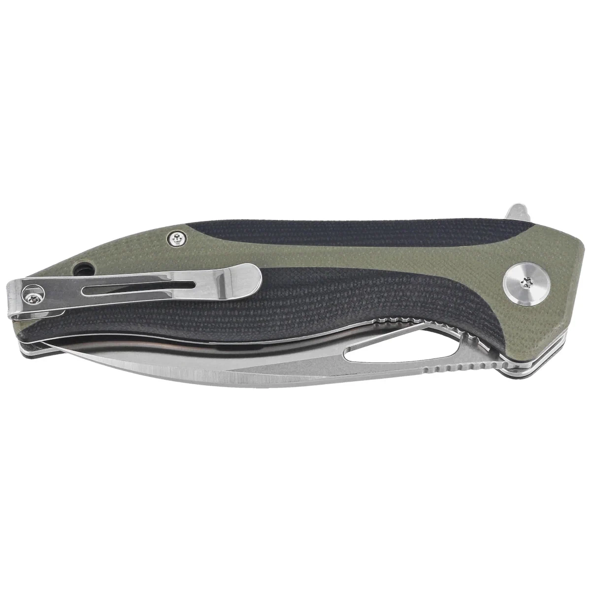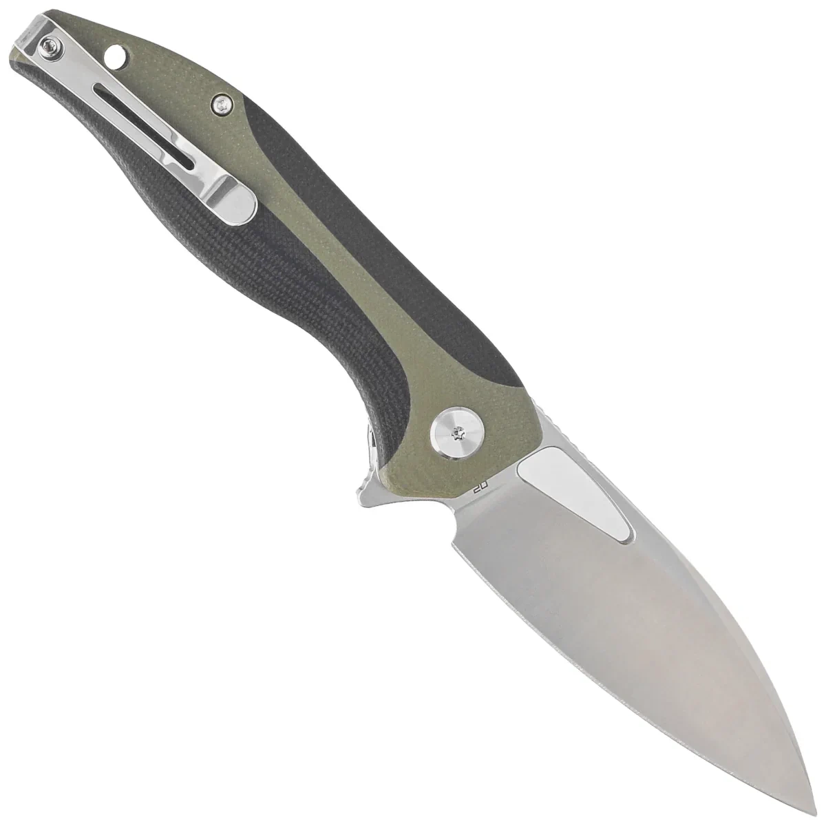 Głownia - typu Drop Point, z efektownym wykończeniem Two Tone, szlif satynowany, pozostała część pokryta Stonewashem. Wydatny brzusiec wydłuża długość krawędzi tnącej w stosunku do długości klingi zbiegając się w kierunku ostrego jak igła czubka noża. Grubość klingi zapewnia wysoką wytrzymałość podczas gdy wysoki, płaski szlif daje doskonałą geometrię krawędzi tnącej oraz ekstremalną wydajność cięcia. Łożyska kulkowe wspomagają otwarcie ostrza za pomocą szybkiej płetwy flippera (index-finger flipper) po otwarciu pełniącej funkcję jelca. Nóż możemy otworzyć również przy pomocy otworu w głowni. Fragment grzbietu klingi pokryto upper jimping, karbowanym oparciem pod kciuk ułatwiającym kontrolę nad nożem. Całość blokowana jest sprawdzoną i popularną blokadą liner lock.