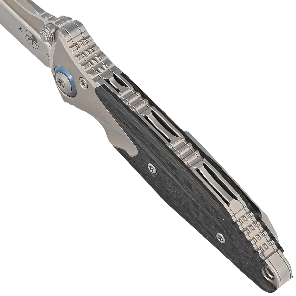 Rękojeść - wykonana z doskonałą precyzją w technologii 3D na frezarkach CNC z tytanu. Perfekcyjnie spasowane wkładki (inlay) z kompozytu Carbon Fiber powodują, że nóż nie ślizga się w dłoni podczas używania. Na grzbiecie rękojeści znajdują się nacięcia (jimping) dla pewniejszego chwytu. Ergonomiczny profil oraz frezowany jednopozycyjny (prawa) masywny klips, umożliwiają dyskretne przenoszenie noża w kieszeni, w pozycji tip-up(czubkiem ostrza do góry). Oś pivota ozdobiona niebieską obręczą (pivot collar cap). W tylnej części znajduje się lanyard hole, miejsce na linkę zabezpieczająca lub ozdobną. Wystający fragment tytanowego szkieletu może służyć jako improwizowany zbijak do szyb.