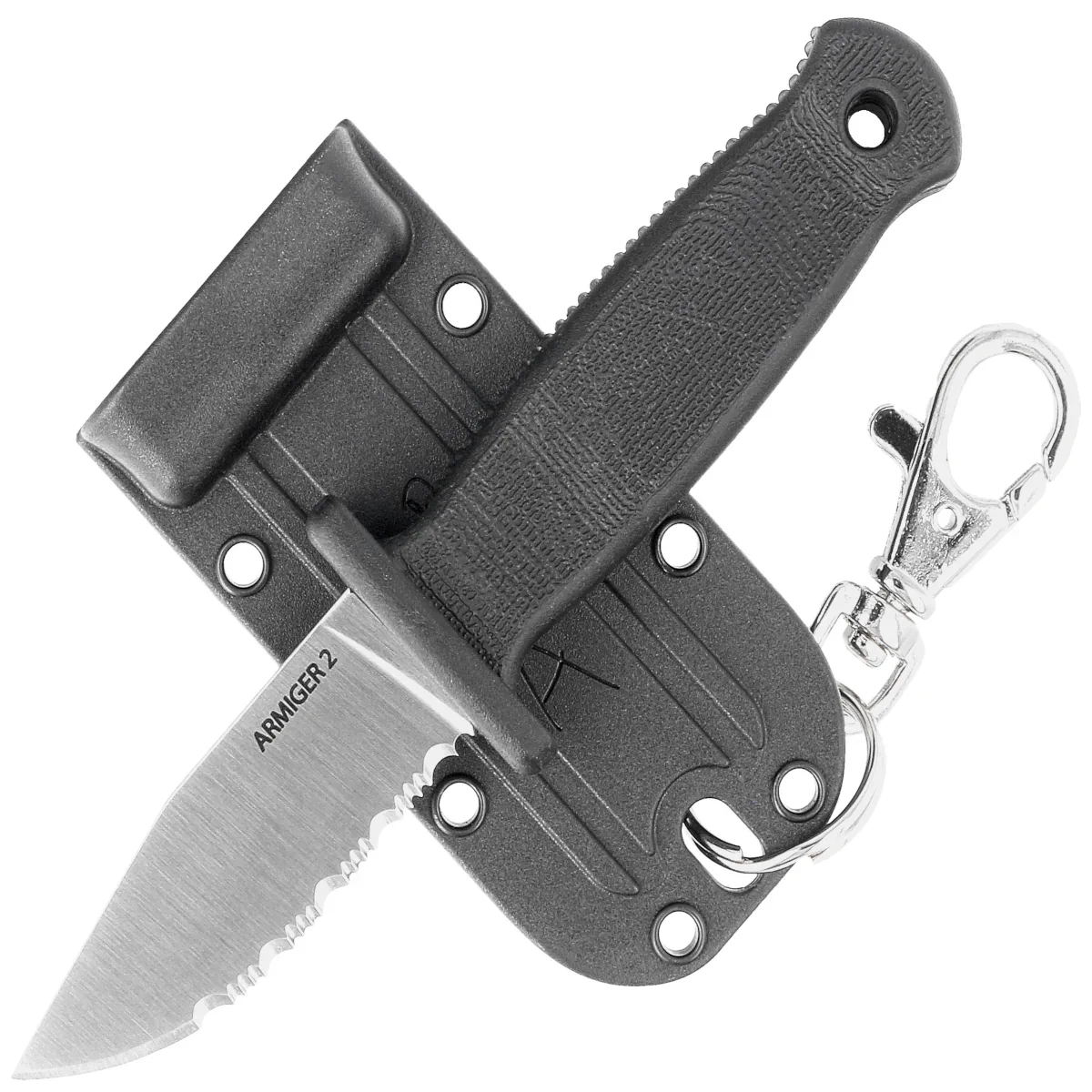 • Armiger 2 Clip Point Black Thermal Plastic Rubber, Satin Serrated kompaktowy nóż typu neck knife. Budowa full tang, wygodna rękojeść zapewniająca pewny uchwyt. Pochwa z kydexu z karabińczykiem. Projekt byłego projektanta firmy Cold Steel, Andrew Demko.