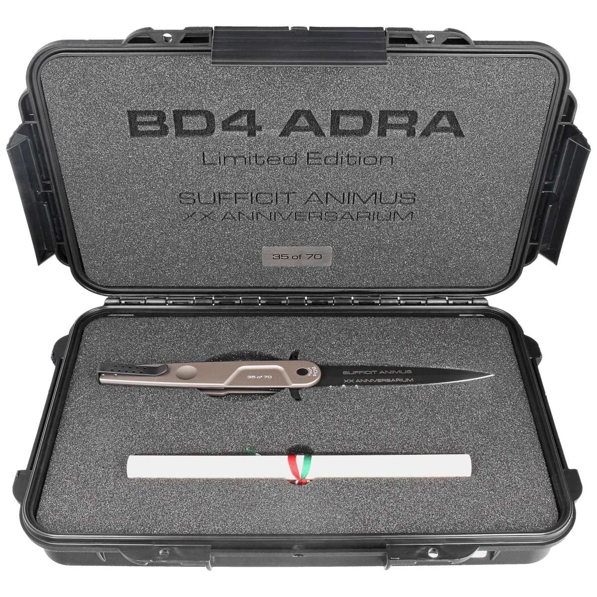 BD4 Adra Contractor LE No 35/70 Tactical Mud Aluminium, Black Limited Edition. Ograniczona do 70 szt. limitowana edycja dużego, składanego noża taktycznego wydana z okazji 20 lecia powstania specjalnej jednostki Włoskich Sił Powietrznych - 17 Stormo Incursori. Nóż o numerze 35. Jego nazwa nawiązuje i jest hołdem dla bohaterskiej jednostki Arditi Distruttori z Regia Aeronautica (ADRA), działającej w Afryce Północnej podczas II wojny światowej, która zdobyła dwa srebrne medale za męstwo na polu walki.