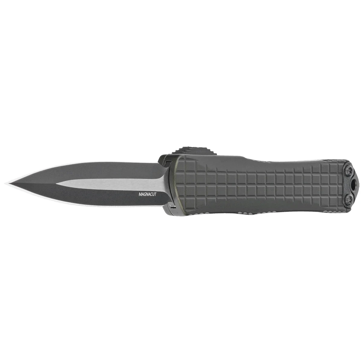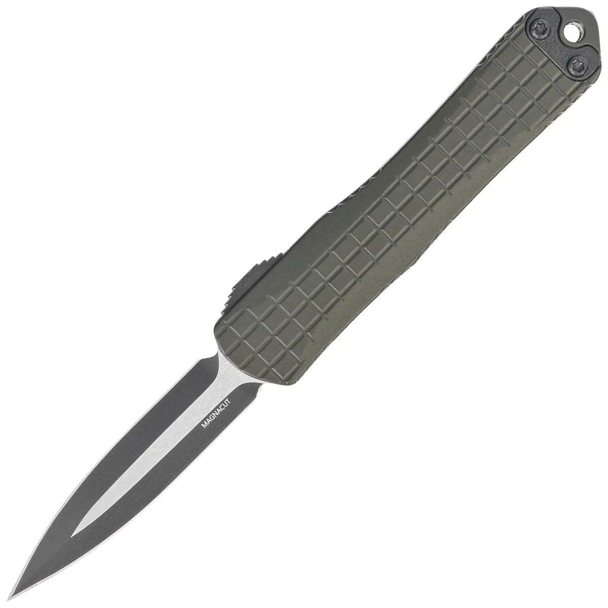 Głownia - szlifowana maszynowo typu D/E (Double Edge Dagger) z obusiecznym symetrycznym ostrzem. Klinga z eleganckim wykończeniem Two Tone, szlify pokryte czarną powłoką, pozostała część satynowana, wyprowadzona wysokim szlifem płaskim (Flat Grind), zapewniającym doskonałe właściwości tnące. Dzięki temu przy zachowaniu dużej wytrzymałości nóż ma znakomite właściwości przy przebijaniu. Mocny mechanizm wysuwania / chowania klingi za pomocą moletowanego Thumb Slide, schodkowego suwaka wymaga dla bezpieczeństwa przyłożenia konkretnej siły do pokonania oporu sprężyny. Sposób otwierania zapewnia bezproblemowe otwarcie osobom prawo, jak i leworęcznym.