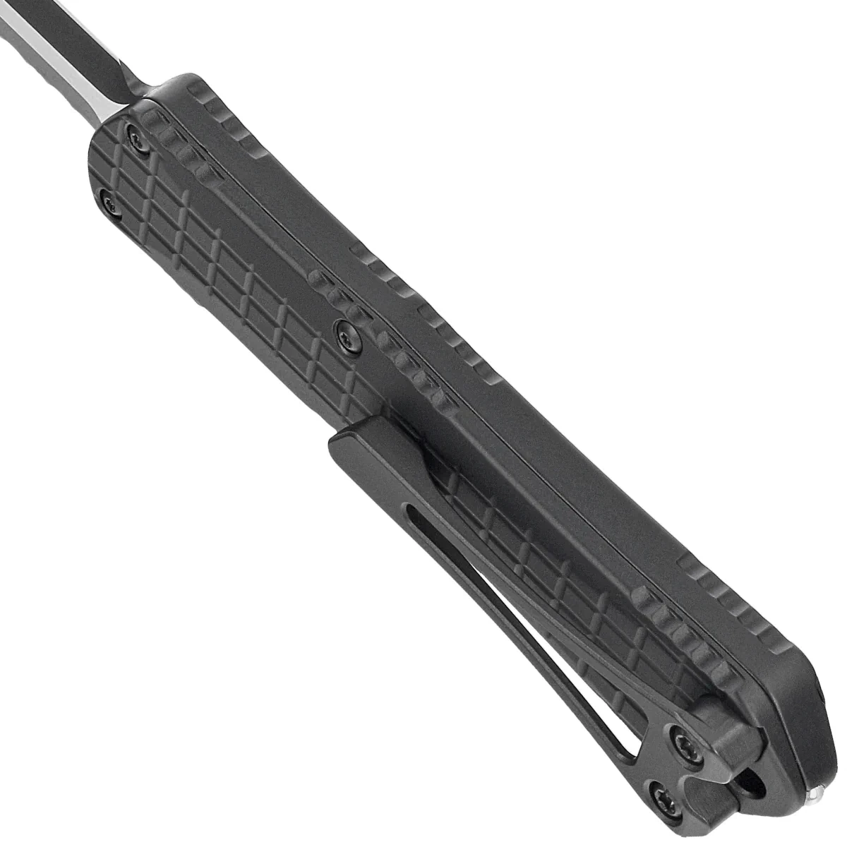 Głownia - szlifowana maszynowo typu D/E (Double Edge Dagger) z obusiecznym symetrycznym ostrzem, ząbkowanym po jednej stronie. Klinga z eleganckim wykończeniem Two Tone, szlify pokryte czarną powłoką, pozostała część satynowana, wyprowadzona wysokim szlifem płaskim (Flat Grind), zapewniającym doskonałe właściwości tnące. Dzięki temu przy zachowaniu dużej wytrzymałości nóż ma znakomite właściwości przy przebijaniu. Mocny mechanizm wysuwania / chowania klingi za pomocą moletowanego Thumb Slide, schodkowego suwaka wymaga dla bezpieczeństwa przyłożenia konkretnej siły do pokonania oporu sprężyny. Sposób otwierania zapewnia bezproblemowe otwarcie osobom prawo, jak i leworęcznym.
