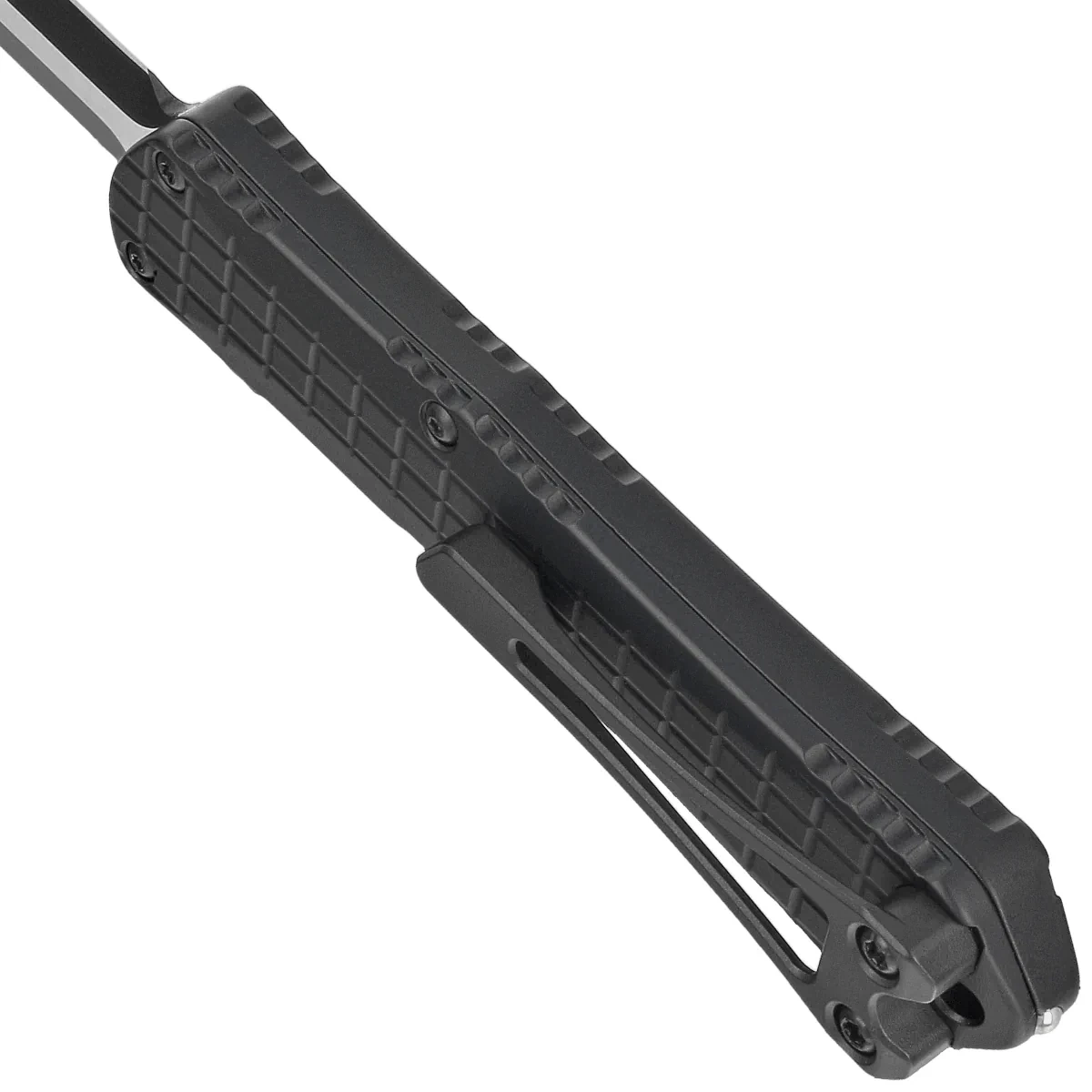 Głownia - szlifowana maszynowo typu D/E (Double Edge Dagger) z obusiecznym symetrycznym ostrzem. Klinga z eleganckim wykończeniem Two Tone, szlify pokryte czarną powłoką, pozostała część satynowana, wyprowadzona wysokim szlifem płaskim (Flat Grind), zapewniającym doskonałe właściwości tnące. Dzięki temu przy zachowaniu dużej wytrzymałości nóż ma znakomite właściwości przy przebijaniu. Mocny mechanizm wysuwania / chowania klingi za pomocą moletowanego Thumb Slide, schodkowego suwaka wymaga dla bezpieczeństwa przyłożenia konkretnej siły do pokonania oporu sprężyny. Sposób otwierania zapewnia bezproblemowe otwarcie osobom prawo, jak i leworęcznym.