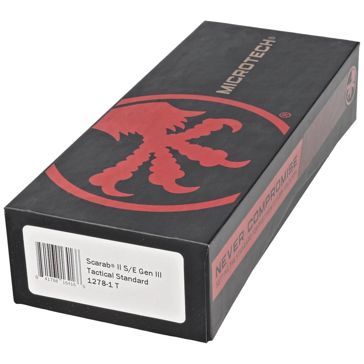 Scarab II Gen III S/E Black Aluminium/3M, Tactical z czarnym taktycznym wykończeniem ostrza to szczyt doskonałości w dziedzinie automatycznych noży taktycznych, czerpiący inspirację z oryginalnego projektu Microtech Ultratech. Zbudowany, aby wytrzymać najtrudniejsze warunki, nowy Scarab II jest najlepszym wyborem do intensywnego użytkowania. Zachowując cechy stylistyczne swojego poprzednika, wyznacza nowy standard dla technologii OTF (Out The Front).