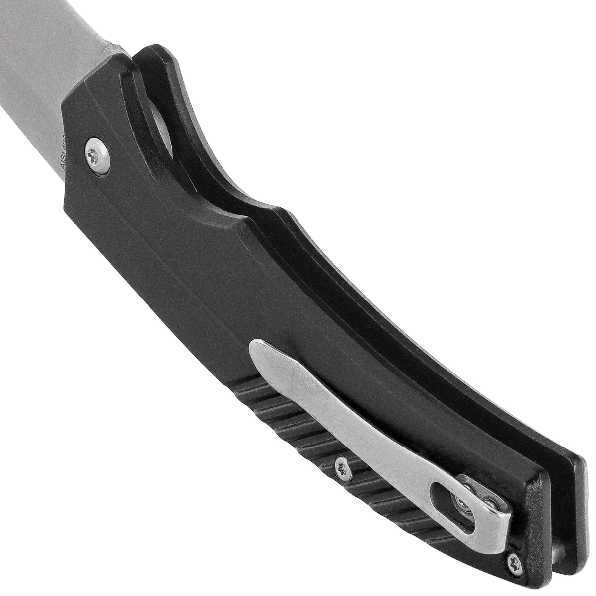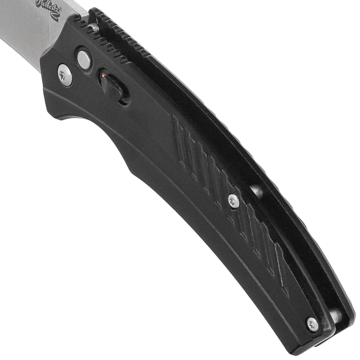 Głownia - typu Drop Point wykończona eleganckim satynowaniem. Niewielka grubość klingi w połączeniu z wysokim, wklęsłym szlifem (Hollow Grind) daje doskonałą geometrię krawędzi tnącej oraz ekstremalną wydajność cięcia. Podkładki wspomagają płynną pracę mechanizmu otwierającego klingę, którą można otworzyć za pomocą sprężyny uruchamianej przyciskiem na rękojeści. Fragment grzbietu klingi pokryto upper jimping, karbowanym oparciem pod kciuk ułatwiającym kontrolę nad nożem. Całość blokowana jest solidną blokadą button lock.