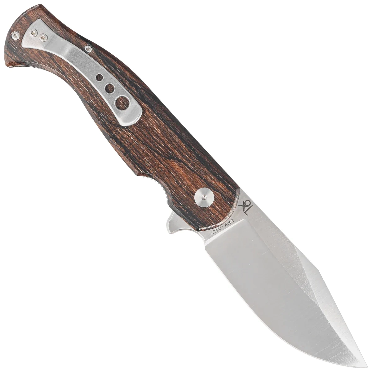 • Eastwood Tiger Ziricote Wood, Satin pełnowymiarowy folder z klingą do agresywnego użytkowania. Zaprojektowany dla tych, którzy szukają niezawodności stałego ostrza i wygody noża składanego. Projekt Gudy van Poppel'a dla włoskiej marki Fox.