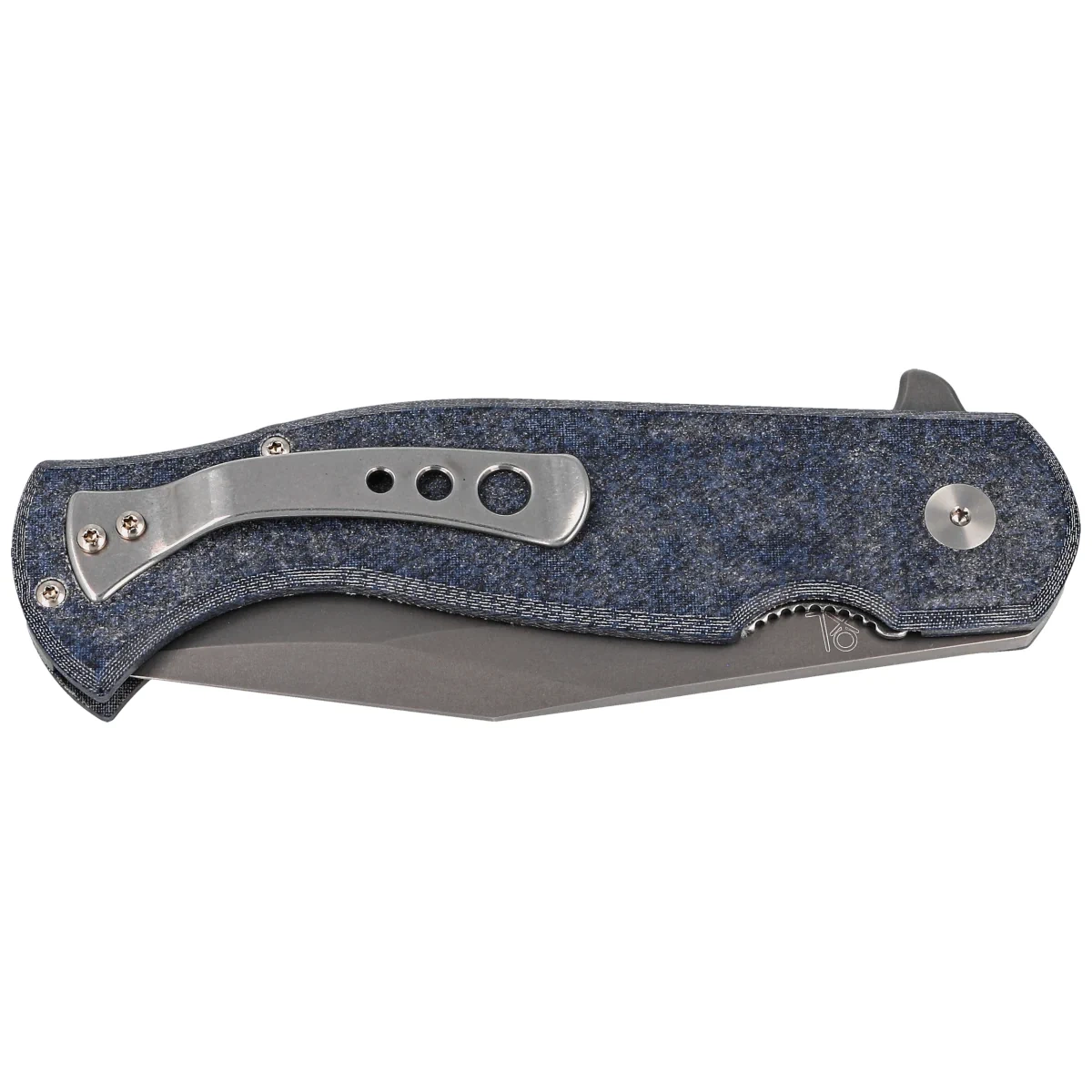 Rękojeść - z jeansowej Micarty (płótno jeansowe prasowane pod wysokim ciśnieniem z żywicą syntetyczną), fazowane krawędzie okładek eliminują ostre krawędzie, a wykonane z przodu podcięcie na palec (fore finger groove) poprawia pewność uchwytu. Okładziny przykręcono do misternie obrobionego aluminiowego backspacera, dają pewność wieloletniego użytkowania. Na całej długości backspacera wykonano upper jimping, karbowane oparcie pod dłoń. Jednopozycyjny (prawa) stalowy klips deep carry pozwala przenosić dyskretnie nóż w kieszeni w pozycji tip-up (czubkiem ostrza do góry). W tylnej części ukryty lanyard hole, otwór do przewleczenia linki zabezpieczającej lub ozdobnej.