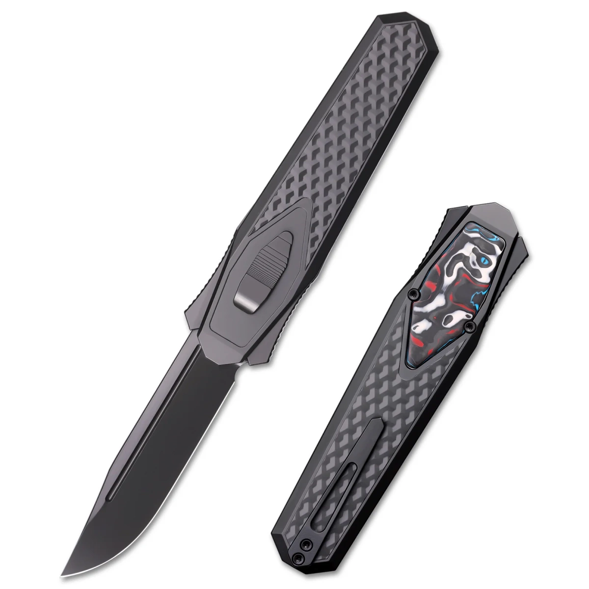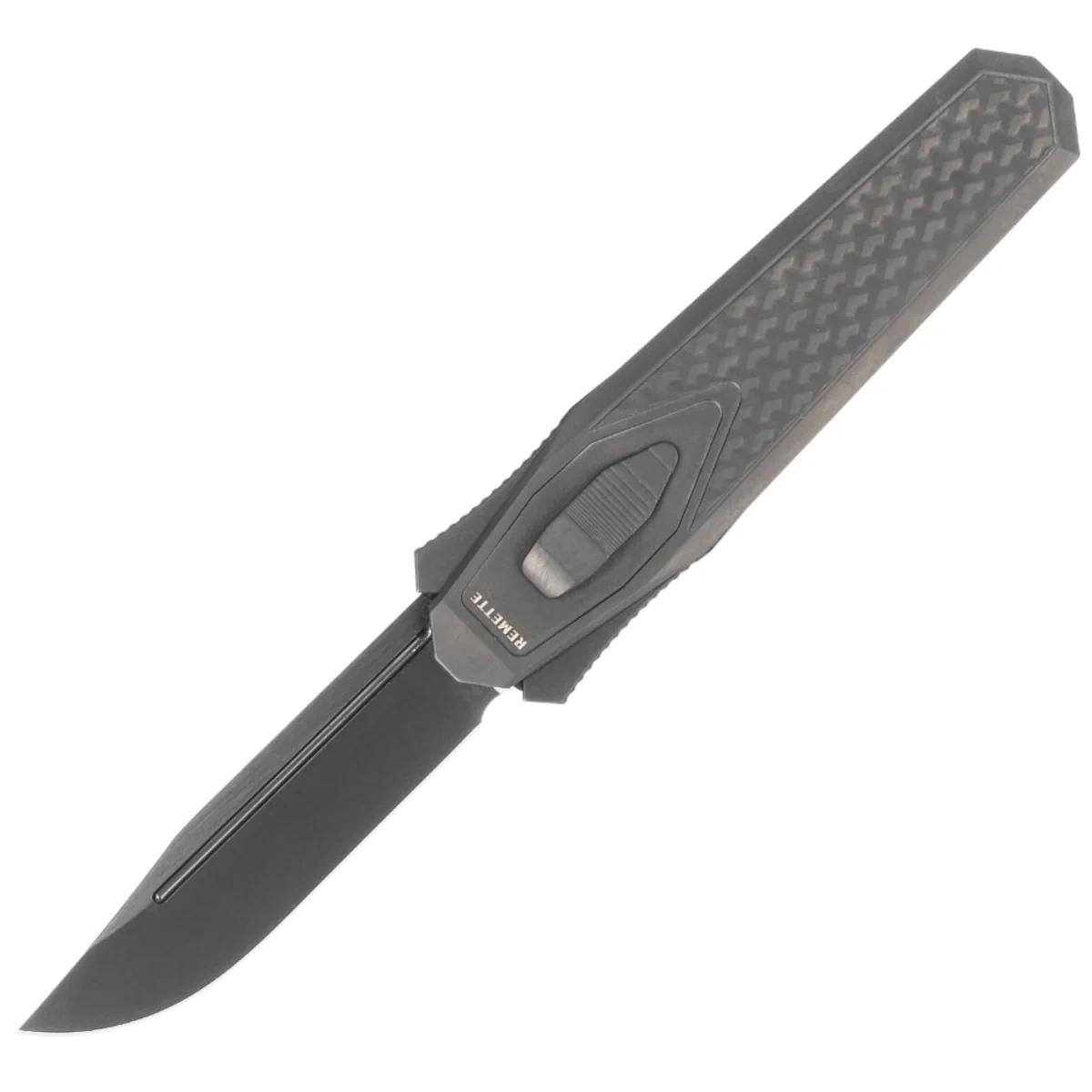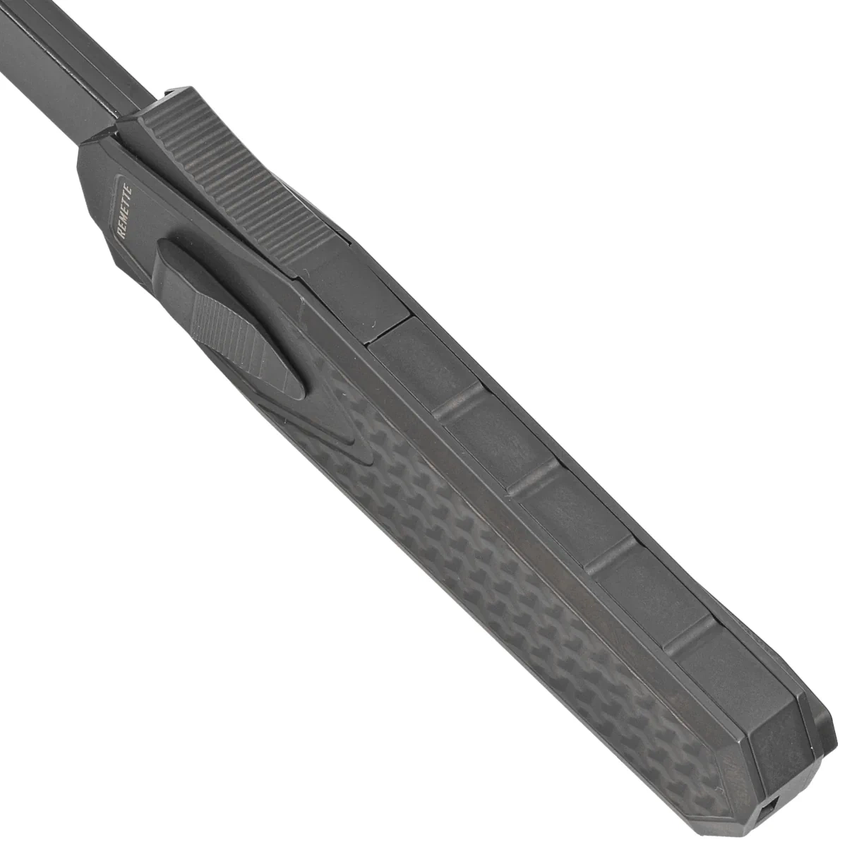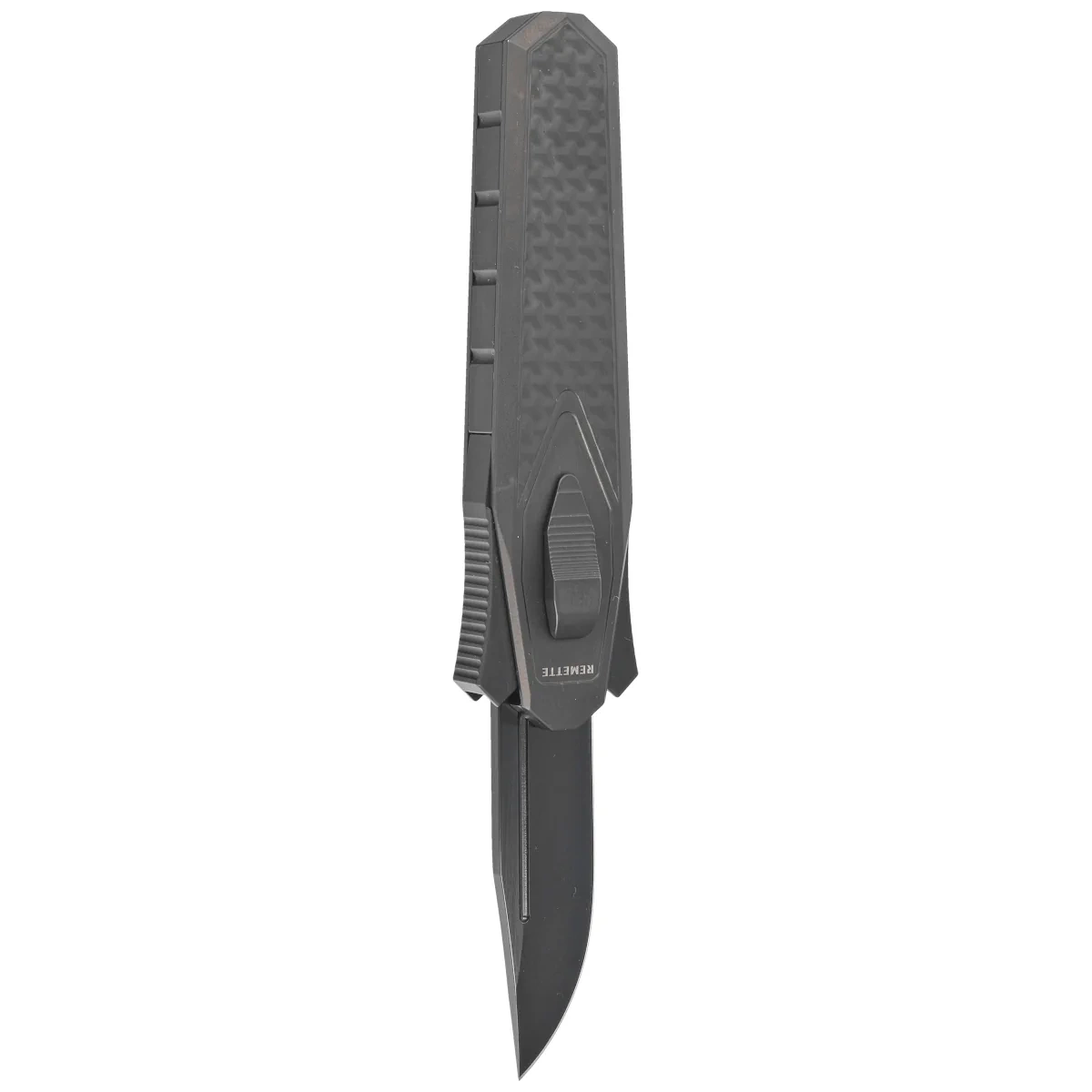 • Swordfish Black DLC Titanium / Red Blue Carbon Fiber, Black DLC Innowacyjny nóż z młodej manufaktury Remette Knives. OTF z wysuwanym dzięki sile grawitacji ostrzem ze stali Böhler M390. Rękojeść z tytanu z nowatorskim systemem uwalniania ostrza