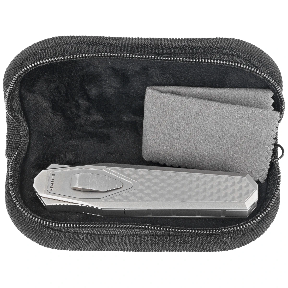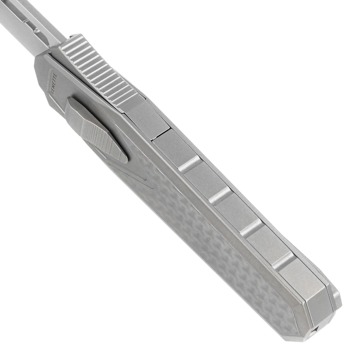 - Swordfish Titanium / Copper Carbon Fiber, Pearlescent. Innowacyjny nóż z młodej manufaktury Remette Knives. OTF z wysuwanym dzięki sile grawitacji ostrzem ze stali Böhler M390. Rękojeść z tytanu z nowatorskim systemem uwalniania ostrza za pomocą suwaka