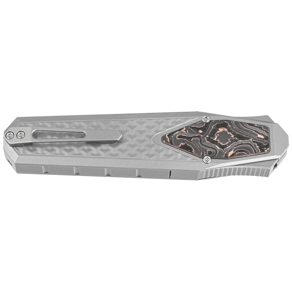 Rękojeść - wykonana na frezarkach CNC z tytanu, z trójwymiarową teksturą. Fazowane krawędzie okładek eliminują ostre ranty, a perfekcyjnie dopasowana wkładka (inlay) z kompozytu Carbon Fiber z nitkami miedzi nadają ekskluzywnego charakteru oraz poprawiają pewność uchwytu. Po prawej stronie kunsztowny suwak do wysuwania/wsuwania klingi. Jednopozycyjny tytanowy (prawa) klips deep carry umożliwia dyskretne przenoszenie noża w kieszeni w pozycji tip-down (czubkiem ostrza do dołu).