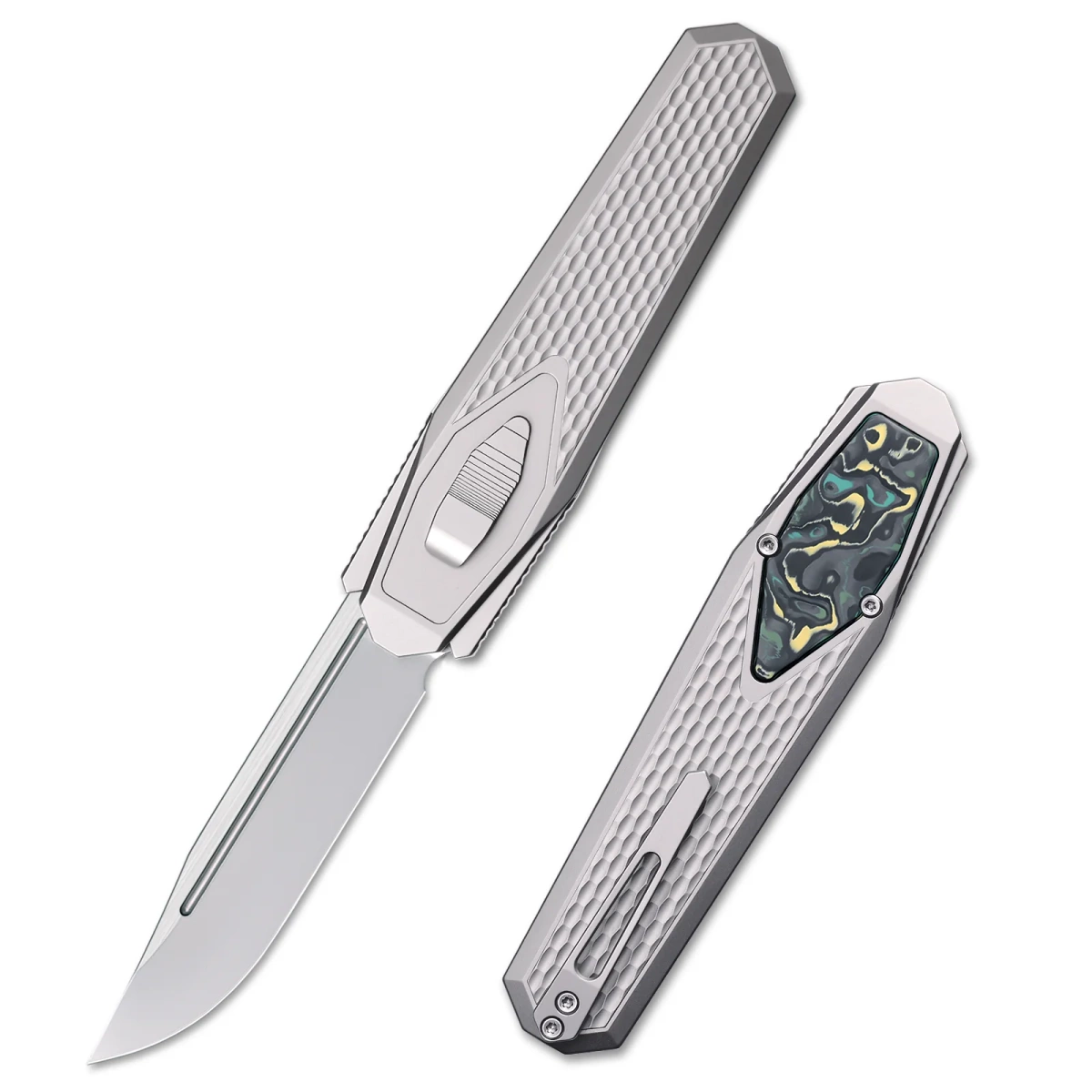 - Swordfish Titanium / Yellow Green Carbon Fiber, Pearlescent. Innowacyjny nóż z młodej manufaktury Remette Knives. OTF z wysuwanym dzięki sile grawitacji ostrzem ze stali Böhler M390. Rękojeść z tytanu z nowatorskim systemem uwalniania ostrza.