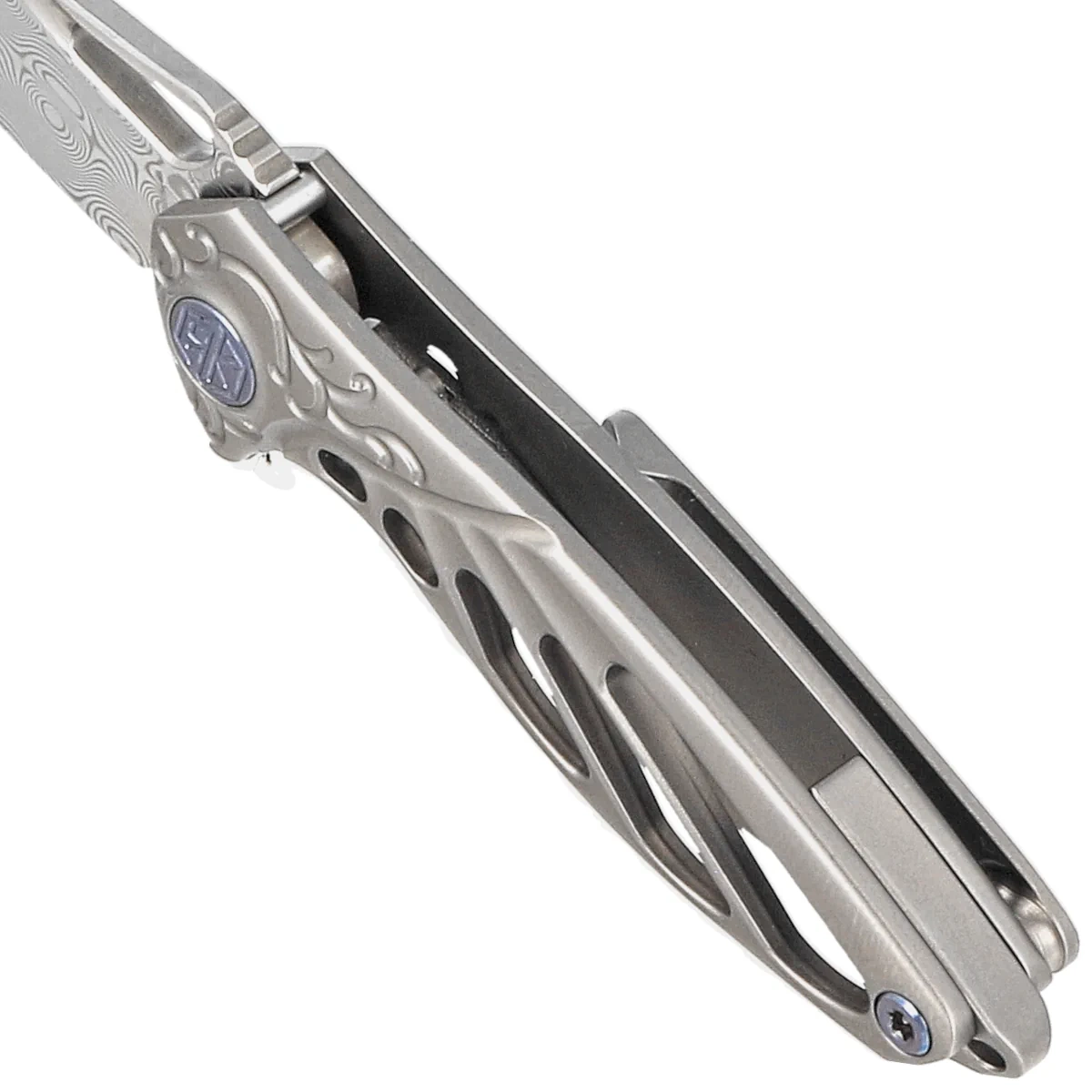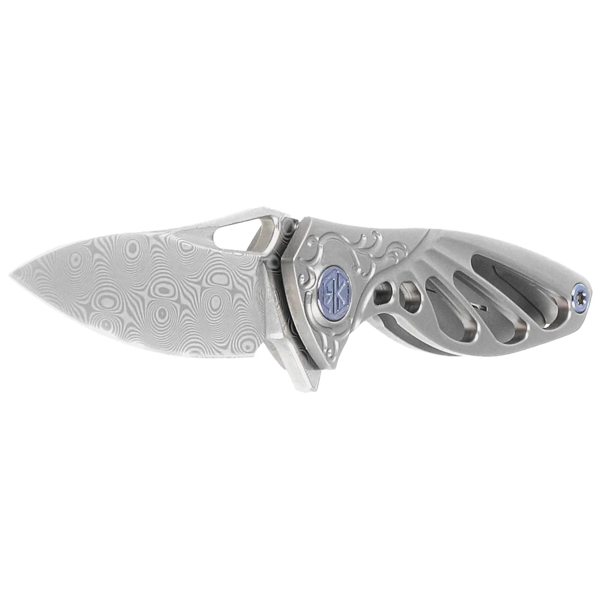 Mini Hummingbird Titanium, Rose Damascus, najwyższej jakości nieduży nóż składany EDC. Głownia z damastu o niepowtarzalnym wzorze. Otwierany szybką płetwą Flippera, okładziny z tytanu, ceramiczne łożyska, pochwa do zawieszania na szyi!