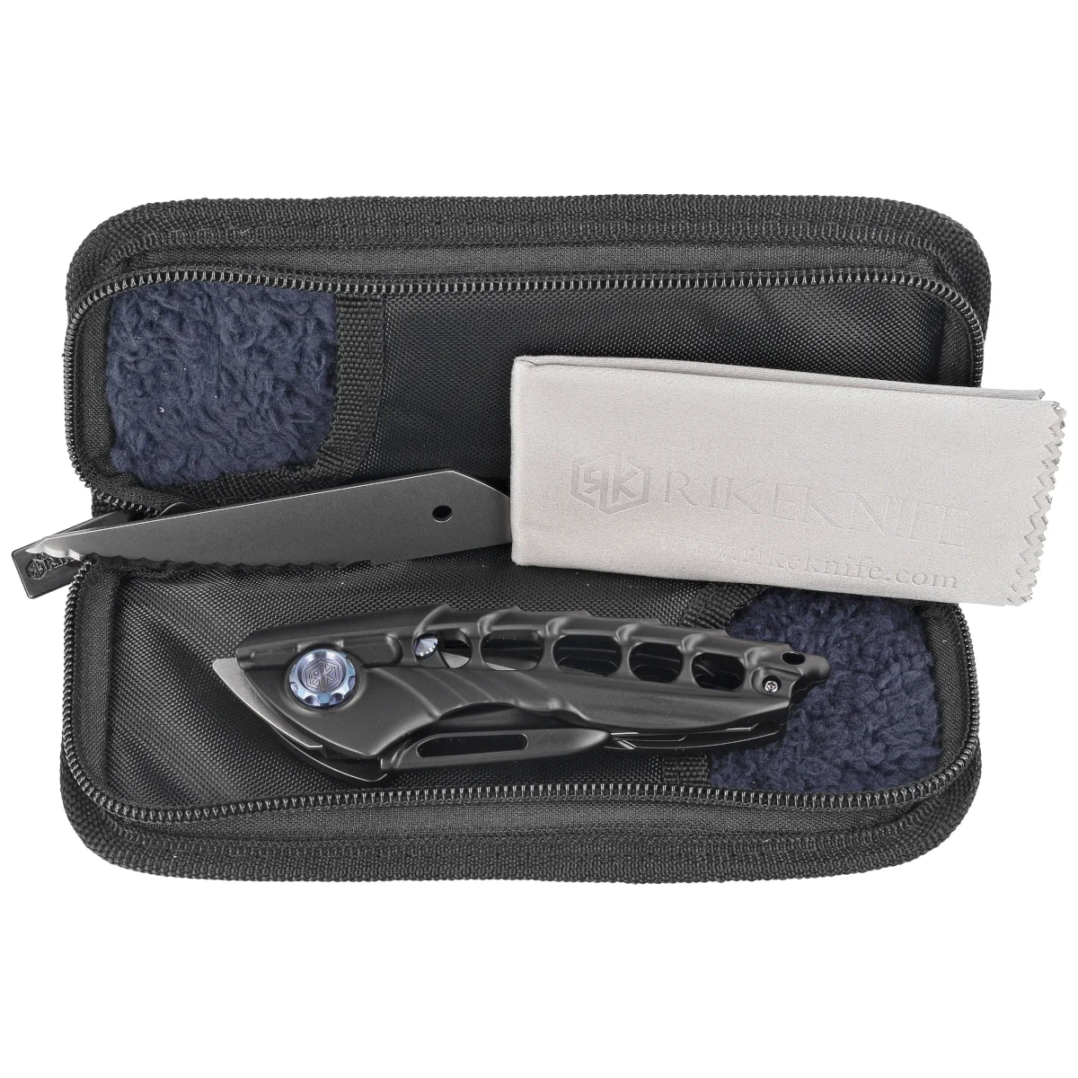 Rękojeść - monolityczna, wykonana z jednego kawałka tytanu 6AL4V frezowanego obrabiarkami CNC 3D, pokryta czarną powłoką DLC. Zapewnia to niewiarygodną wytrzymałość, wymaga jednak najwyższych umiejętności i precyzji w produkcji. Fazowane krawędzie okładek i podcięcie na palec (fore finger groove) eliminują ostre krawędzie i poprawiają ergonomię uchwytu. Na grzbiecie rękojeści stylizowane kręgi które z otworami wyfrezowanymi poniżej przywodzą na myśl fragment szkieletu Aliena. Oś pivota zdobi stylizowane logo marki Rike Knife. Jednopozycyjny (prawa) klips deep carry wyposażony w gładką kulkę rollerball, dzięki której nóż z łatwością wsuwa się do kieszeni nie niszcząc jej brzegów, pozwala przenosić dyskretnie nóż w kieszeni w pozycji tip-up (czubkiem ostrza do góry).