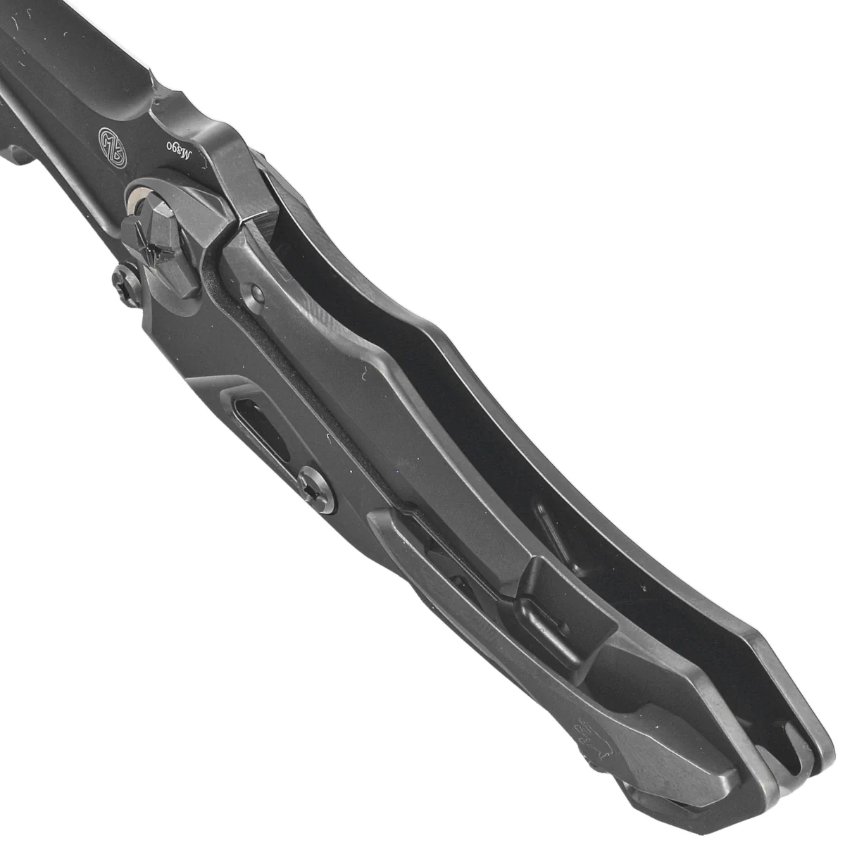 Głownia - typu harpoon, pokryta czarną powłoką DLC. Długa krawędź tnąca, zbiega się w kierunku ostrego jak igła czubka szerokiej klingi. Grubość ostrza i zbrocze zapewniają wysoką wytrzymałość. Zastosowano tu szlif mieszany, w tylnej części jest to wklęsły szlif do cięcia i prac precyzyjnych tzw Hollow Ground Primary Bevel. W przedniej części mamy wysoki, płaski szlif wzmacniający czubek Flat Ground. Nóż możemy otworzyć przy użyciu płetwy front flippera lub podłużnego otworu w klindze (Thumb Hole). Całość blokowana jest nowoczesną blokadą Frame Lock ze stalową wkładką zapobiegającą wycieraniu się czoła blokady.