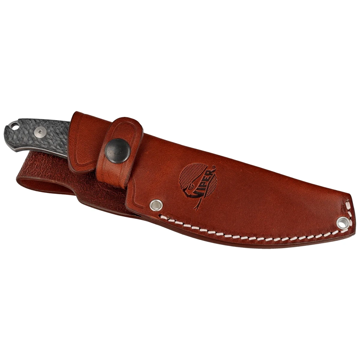 • Nordlys Black Carbon Fiber, Satin, projektu Jensa Ansø. Solidny kawałek sprawdzonej stali nierdzewnej N690, wielofunkcyjny nóż włoskiej marki Viper. Wygodna rękojeść z kompozytu Carbon Fiber, pochwa z wysokojakościowej skóry z mocowaniem do pasa.