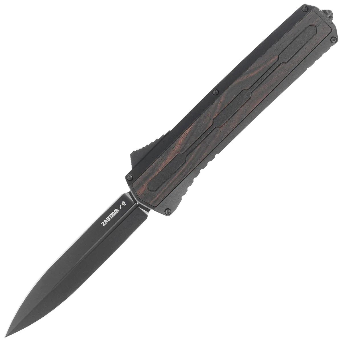 - A7 Zastava D/E Black Aluminium/Tactical Black Wood, Black taktyczny nóż OTF wykonany we współpracy z Zastava Arms czerpie inspirację z kultowego karabinu Zastava M70. Rękojeść z aluminium i drewna. Ostrze stal S35VN pokryta czarną powłoką na bazie tytanu.