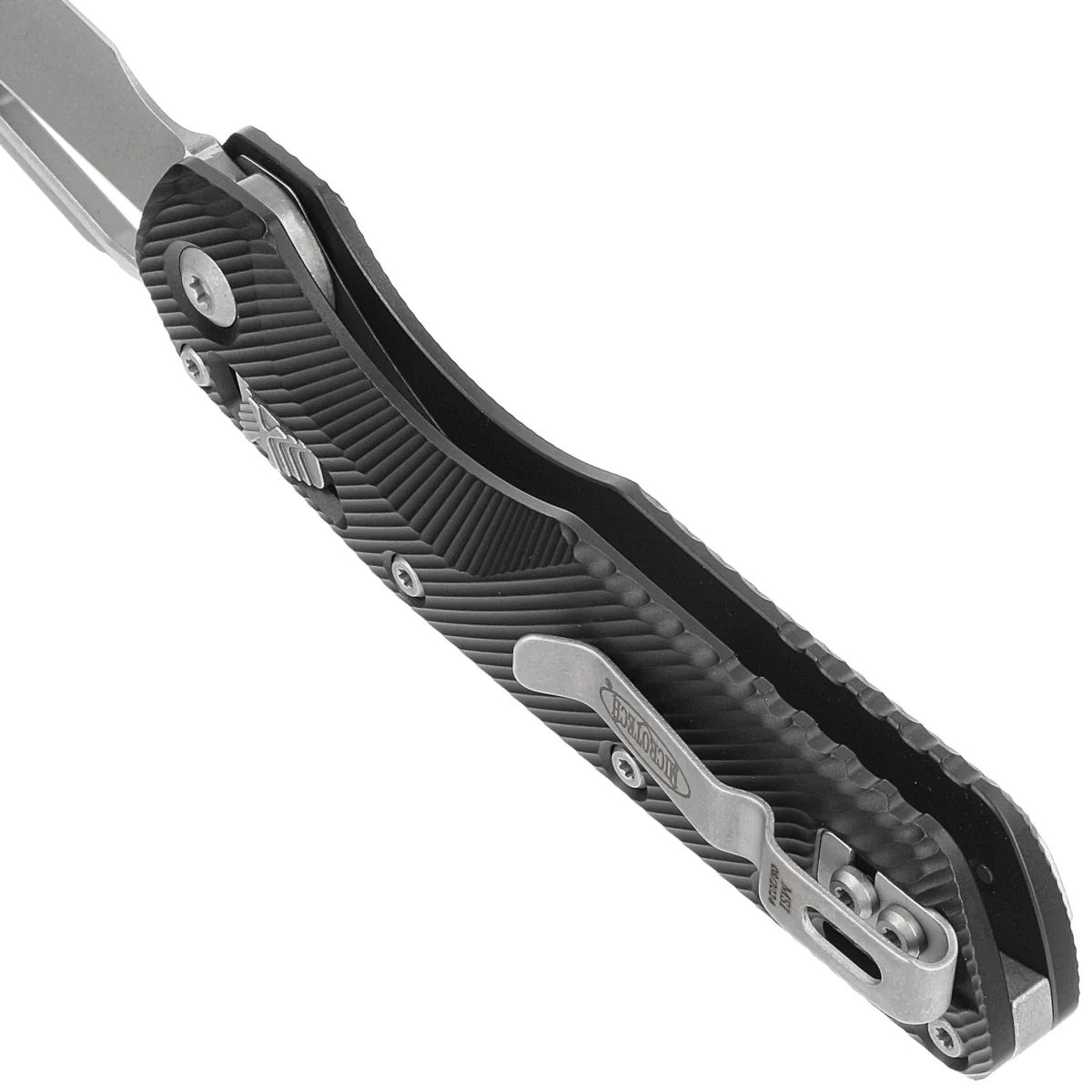 Rękojeść - wykonana z doskonałą precyzją w technologii 3D na frezarkach CNC z anodyzowanego aluminium 6061-T6, dla lepszego uchwytu pokryta wyfrezowanymi liniami (Fluted). Szeroki suwak blokady z charakterystyczną dla firmy Microtech schodkową strukturą X. Obie okładziny zostały skręcone przy pomocy solidnego, aluminiowego backspacera. Dwustronny (prawa / lewa) klips pozwala dyskretnie nosić nóż w pozycji tip-up. Nad klipsem lanyard hole, miejsce na linkę zabezpieczającą lub ozdobną.
