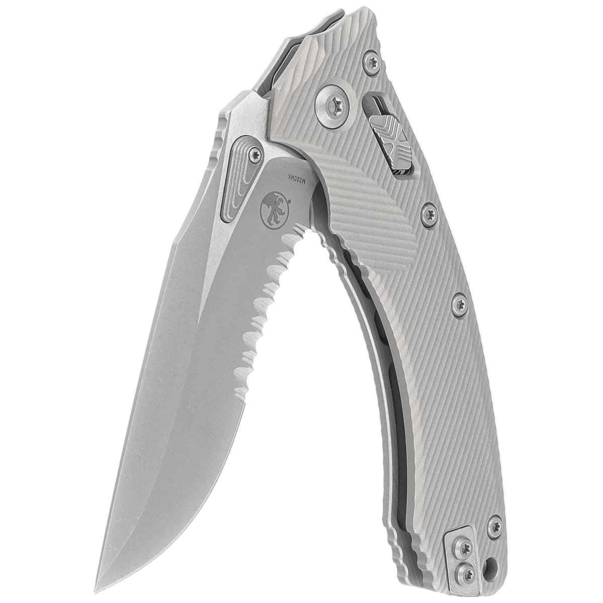 Rękojeść - wykonana z doskonałą precyzją w technologii 3D na frezarkach CNC, ze szczotkowanego i polerowanego aluminium 6061-T6, dla lepszego uchwytu pokryta wyfrezowanymi liniami (Fluted). Szeroki suwak blokady z charakterystyczną dla firmy Microtech schodkową strukturą X. Obie okładziny zostały skręcone przy pomocy solidnego, backspacera. Dwustronny (prawa / lewa) tytanowy klips pozwala dyskretnie nosić nóż w pozycji tip-up. Nad klipsem lanyard hole, miejsce na linkę zabezpieczającą lub ozdobną.
