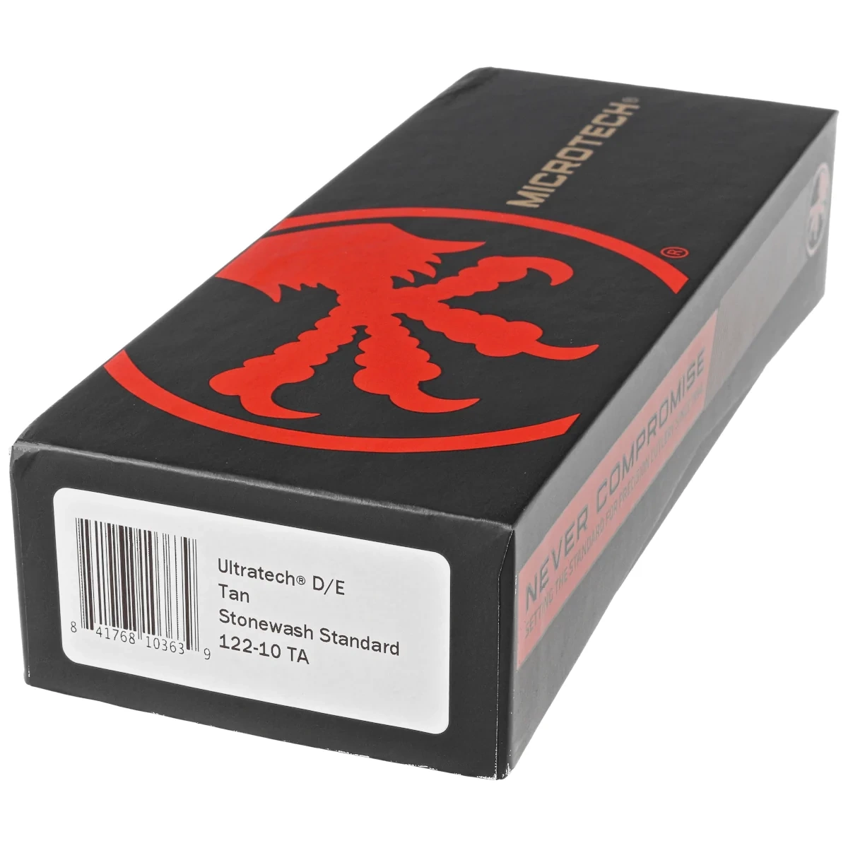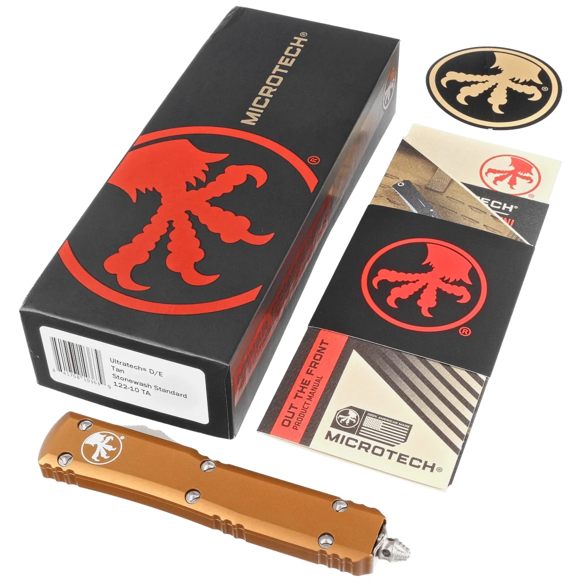 Ultratech D/E Tan Aluminium, Stonewashed to pełnowymiarowy nóż automatyczny OTF (Out The Front) z serii Ultratech. Wyposażony w piekielnie szybki mechanizm wysuwający ostre jak brzytwa ostrze w praktycznym wykończeniu Stonewashed. W 100% wyprodukowany i zmontowany w USA. Projekt Anthony'ego Marfione, knifemakera i właściciela Microtech Knives.