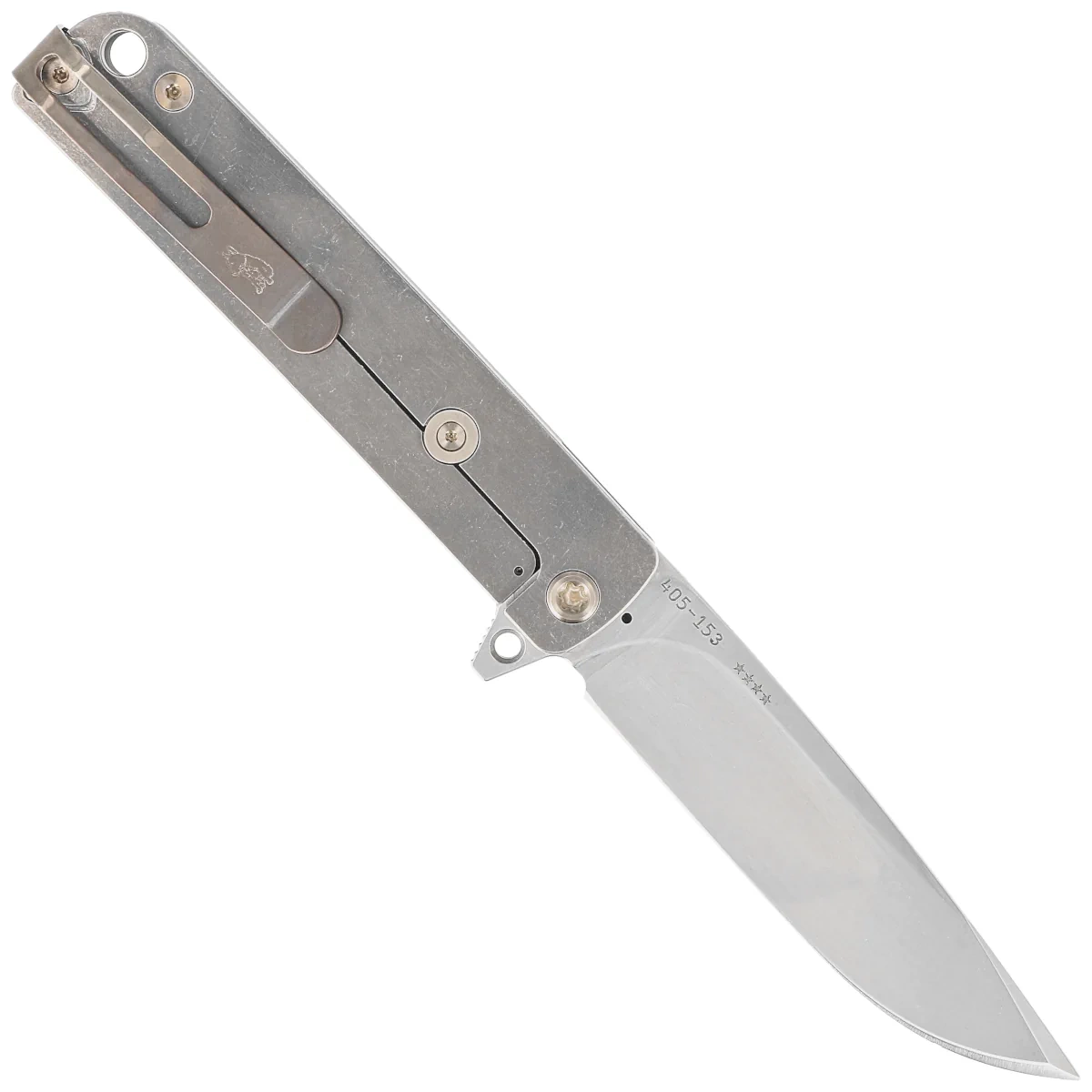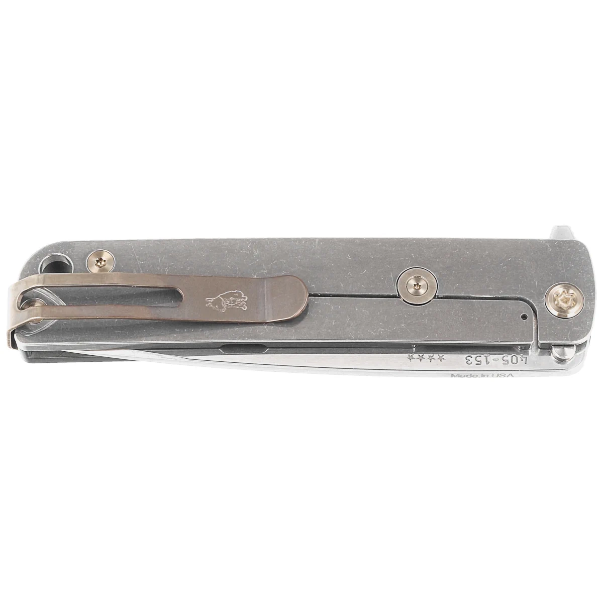 Głownia - smukła o profilu Drop Point wykończona maszynowo metodą „tumbled". Ręcznie wykonane wklęsłe szlify dają doskonałe właściwości tnące połączone z wysoką wytrzymałością. Innowacyjny szlif Magnus Edged wzmacnia czubek noża. Dla płynnej pracy mechanizmu otwierającego zastosowano łożyska kulkowe, dzięki czemu nóż otwiera się gładko i bezszelestnie. Płetwa flippera po rozłożeniu pełni rolę mini gardy chroniącej naszą dłoń. Potężna, tytanowa sztaba frame locka zabezpiecza nóż przed złożeniem, rozłożony i zabezpieczony nóż jest solidny niczym kasa pancerna.