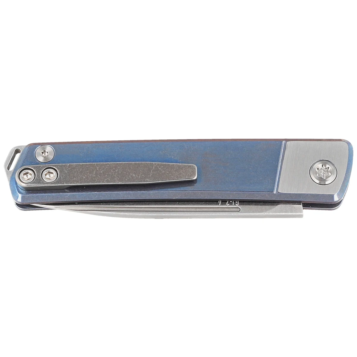 Rękojeść wykonana z tytanu, anodyzowana na niebiesko. W przedniej części, wydzielony fragment w charakterze bolstera, wykończony szlifowaniem tumbled. Całości dopełnia smukły, dyskretny klips, oczywiście również z tytanu. Jednostronny (prawa) klips deep carry umożliwia noszenie noża w pozycji tip-up. Wystający fragment backspacera może słuzyć jako improwizowany zbijak do szyb, zawiera również lanyard hole, otwór na linkę zabezpieczającą lub ozdobną.