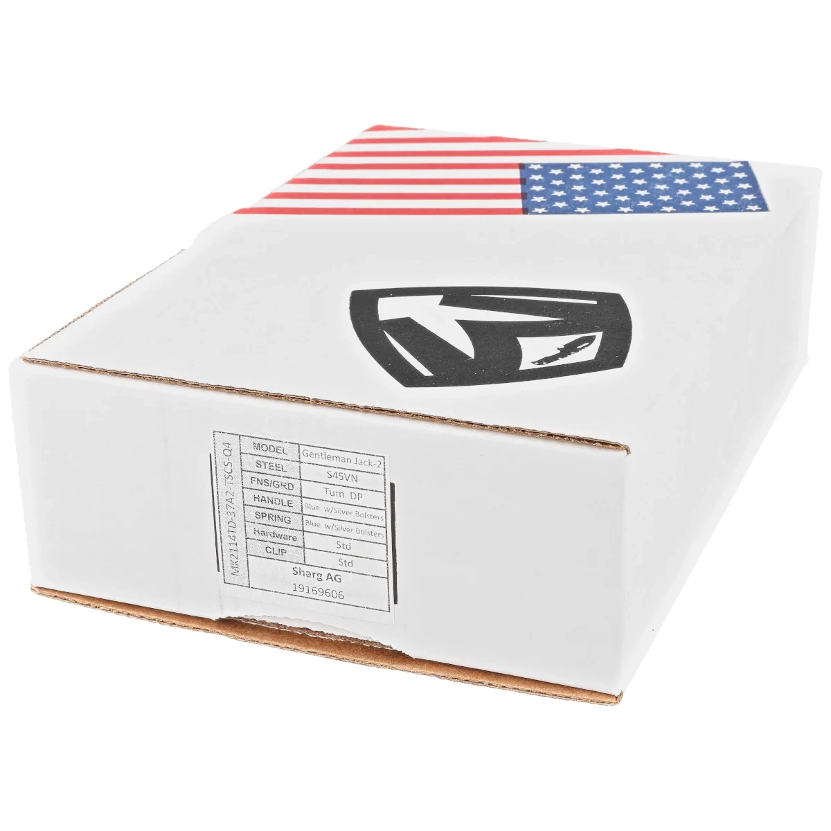 Gentleman Jack Drop Point, Blue / Silver Titanium, Std HW/Clip, Tumbled, elegancki nóż składany, tytanowa rękojeść, głownia z nowoczesnej stali nierdzewnej CPM S45VN. Wyposażony w mechanizm SlipJoint, "no lock", przyjazny społecznie, legalny w większości krajów. Podręczny towarzysz codziennego życia, pasuje do garnituru, lecz wciąż jest zbudowany jak czołg!