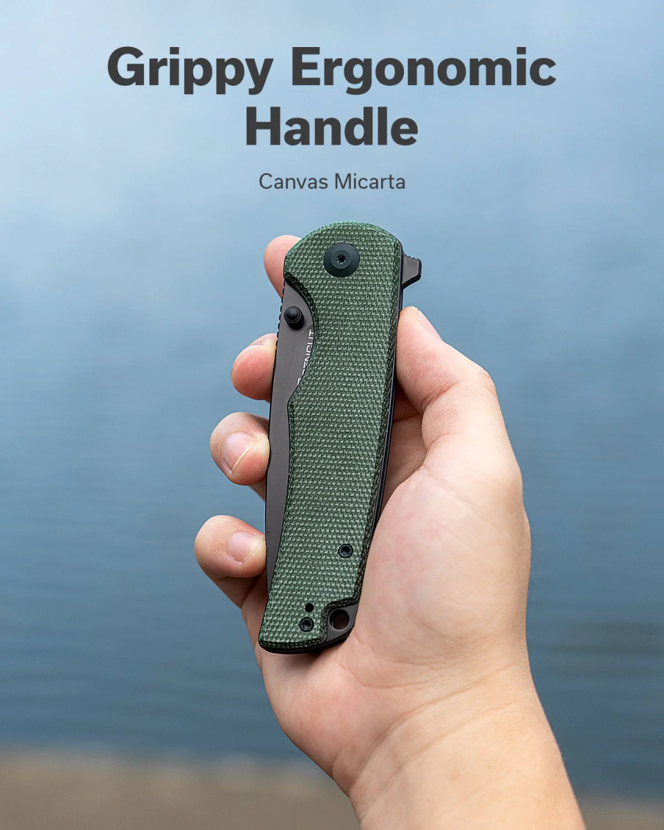 Praktisk Green Canvas Micarta, Black duży nóż składany dla każdego entuzjasty EDC. Głownia Drop Point ze stali nierdzewnej 9Cr18MoV, okładziny rękojeści z kompozytu Canvas Micarta. Obustronny kołek Thumb Stud, szybka płetwa Flippera (index-finger flipper) umożliwiają otwarcie ostrza na dwa sposoby. Solidna budowa, która nie zawiedzie. Idealny towarzysz podczas codziennych wędrówek! Bestseller!