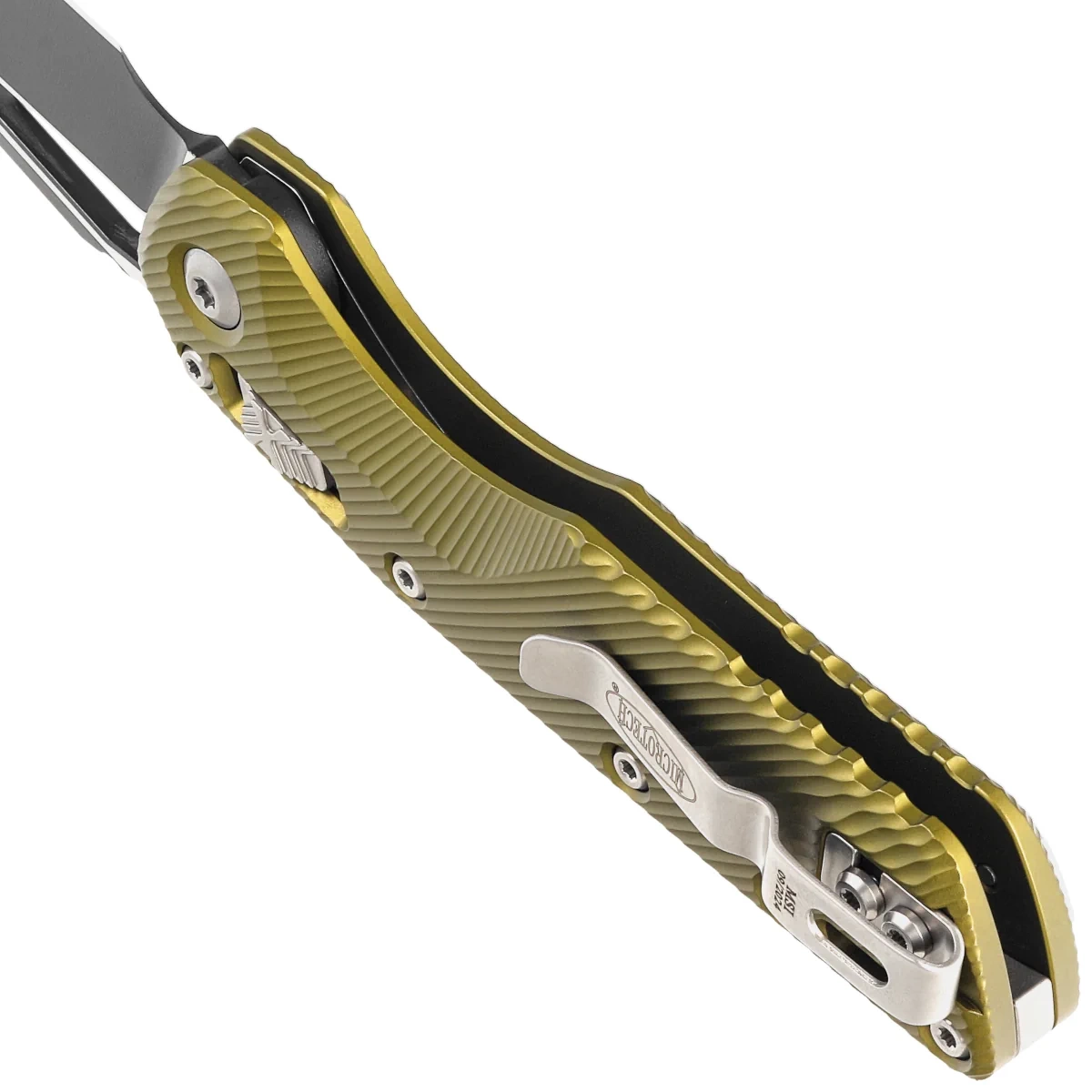 Rękojeść - wykonana z doskonałą precyzją w technologii 3D na frezarkach CNC z anodyzowanego aluminium 6061-T6, dla lepszego uchwytu pokryta wyfrezowanymi liniami (Fluted). Szeroki suwak blokady z charakterystyczną dla firmy Microtech schodkową strukturą X. Obie okładziny zostały skręcone przy pomocy solidnego, aluminiowego backspacera. Dwustronny (prawa / lewa) klips pozwala dyskretnie nosić nóż w pozycji tip-up. Nad klipsem lanyard hole, miejsce na linkę zabezpieczającą lub ozdobną.