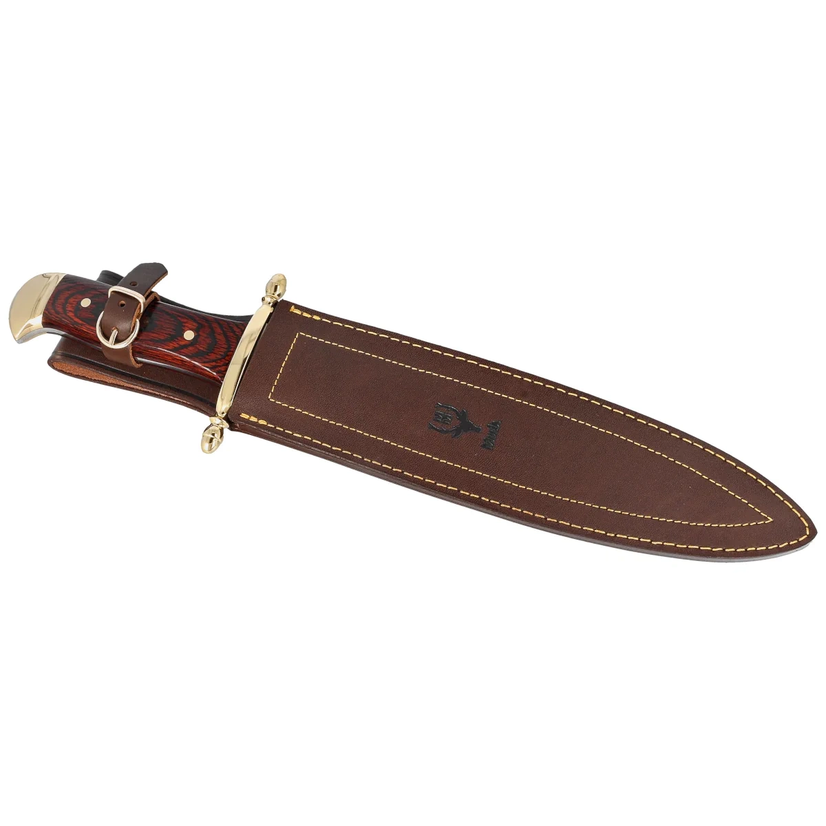 Pochwa - ręcznie szyta, wykonana z najwyższej jakości skóry wołowej w kolorze brązowym z tłoczonym logo producenta. Brzegi etui przeszyto ozdobną nicią. Zapinana na zatrzask typu Prym. Mocowanie do pasa umożliwia przenoszenie noża w pozycji pionowej.