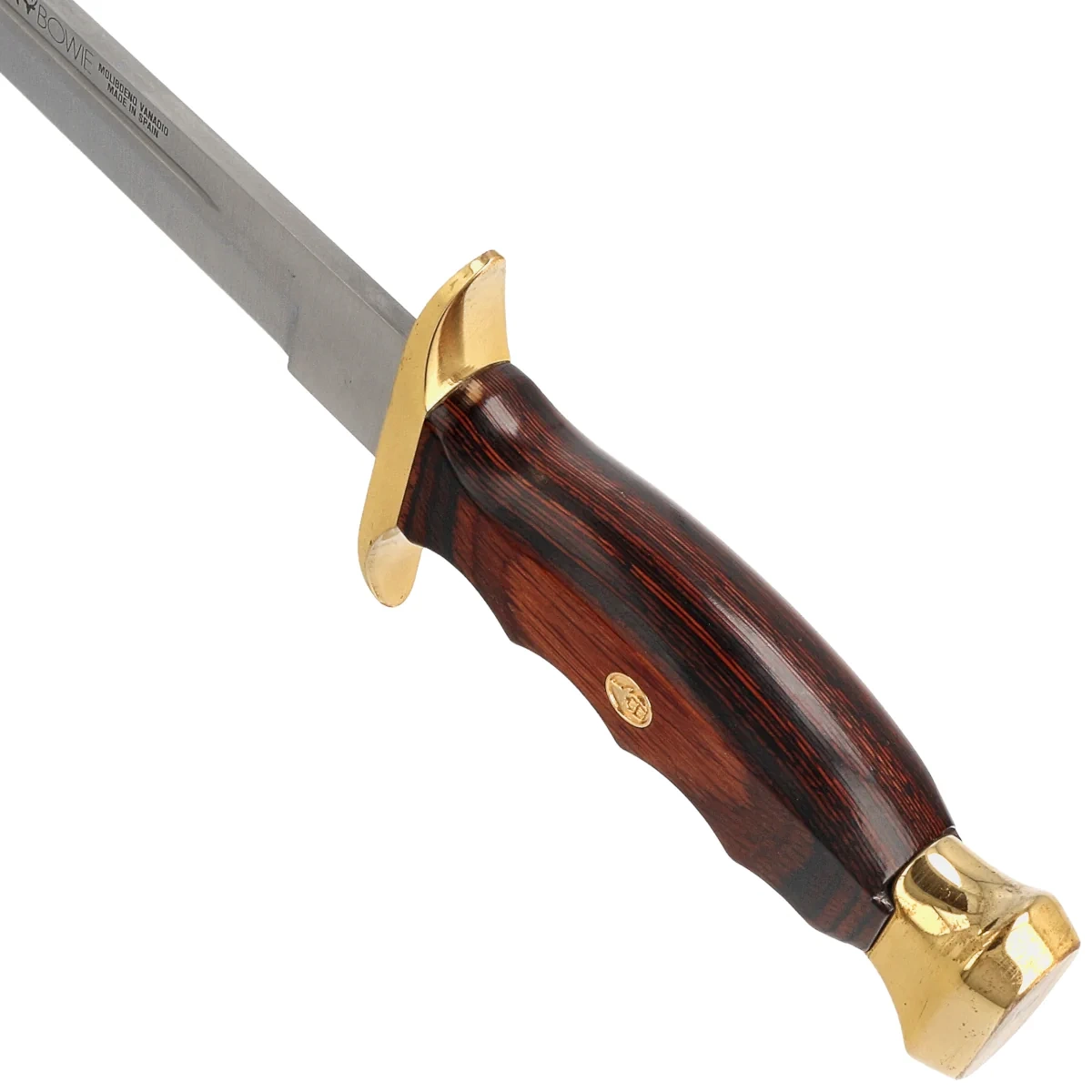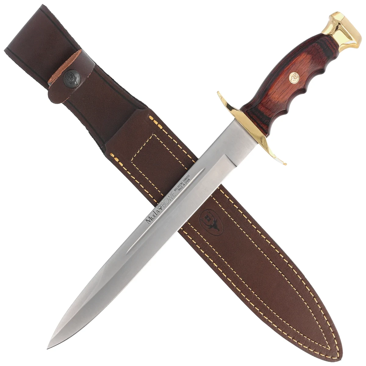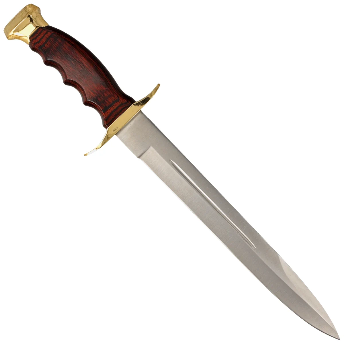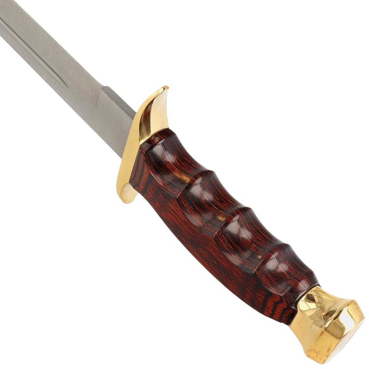 Głownia - ostrze o profilu Spear Point wykończone eleganckim Satynowaniem. Mimo grubości, szlif wklęsły zapewnia doskonałe właściwości tnące połączone ze znakomitą wytrzymałością. Długie fałszywe ostrze zwiększa właściwości przebijające. Obustronna garda wykonana z mosiądzu, zabezpiecza palce przed ześlizgnięciem się na ostrze podczas pracy.