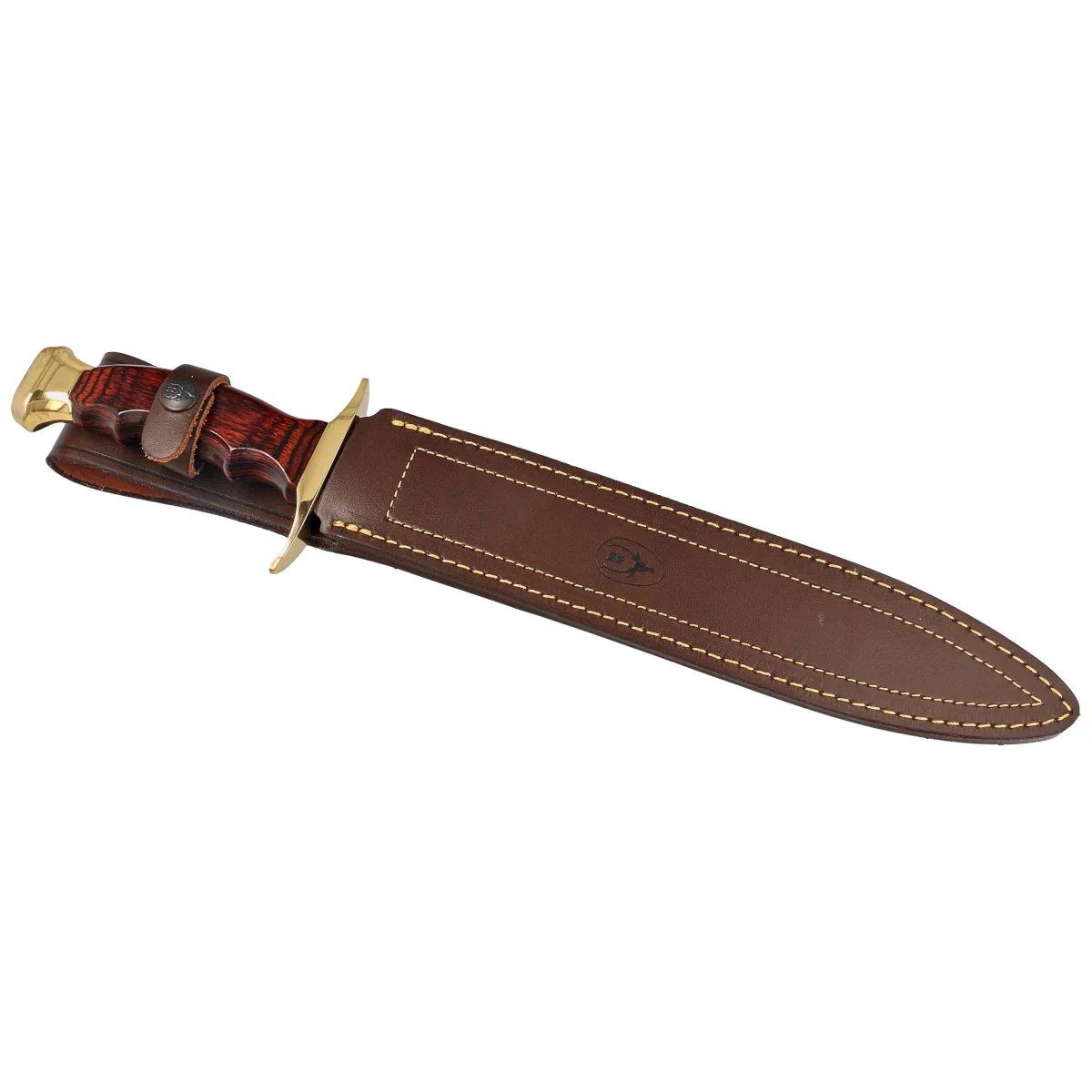 - BW-26 nóż ze stałą klingą ze stali molibdenowo-wanadowej MoVa przeznaczony do wszelakich prac w terenie. Okładziny o niepowtarzalnym wzorze z drewna syntetycznego coral pakka wood zakończone mosiężnymi głowicami. Ręcznie szyta skórzana pochwa.