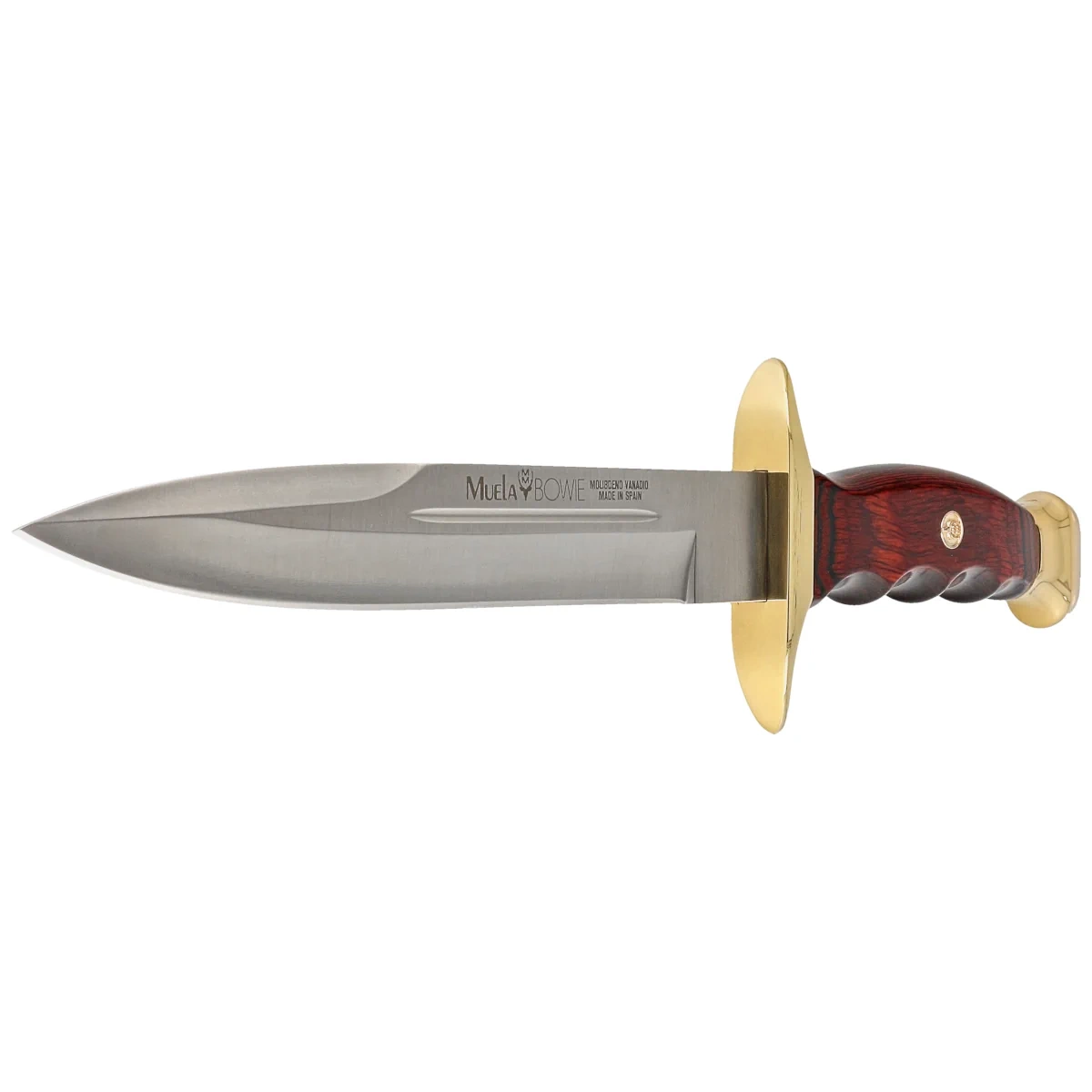 - Muela BW-19 Pakka Wood, Satin duży nóż ze stałą klingą ze stali X50CrMoV15. Okładziny o niepowtarzalnym wzorze z drewna coral pakka zakończone mosiężnymi głowicami. Ręcznie szyta skórzana pochwa. Skierowany do pasjonatów survivalu, outdooru i myślistwa.