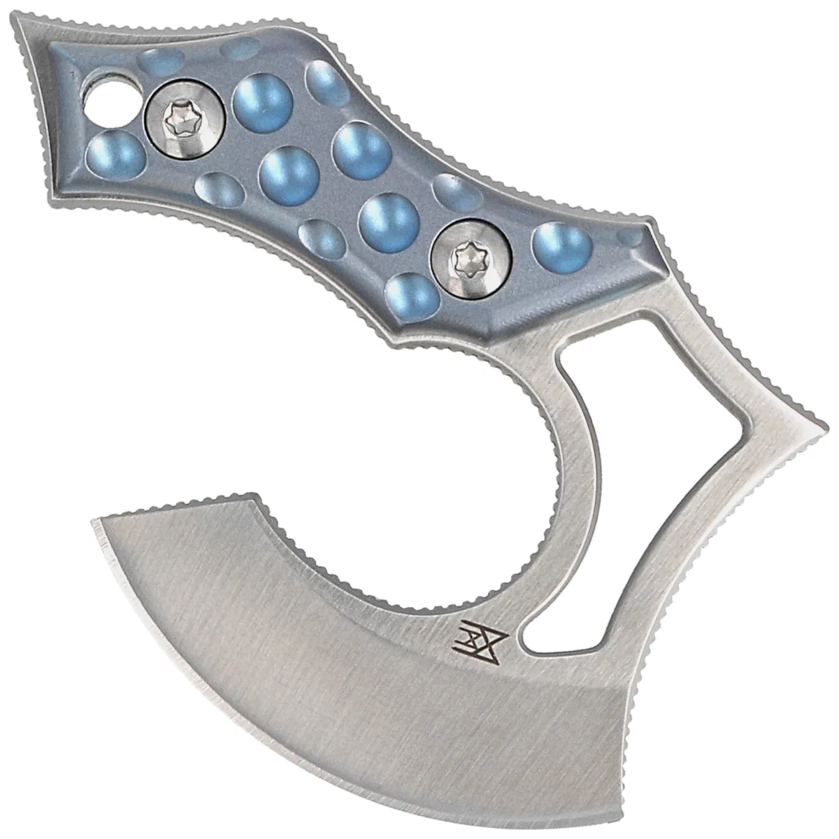 - Nori Nano Blue Titanium, Satin, wzorowany na stylistyce wikińskich toporów podręczny nóż ze stałym ostrzem. Wygodna rękojeść z tytanu zapewnia pewny chwyt w każdym ułożeniu, głownia ze stali nierdzewnej Sandvik 14C28N. Innowacyjna pochwa z magnesami.