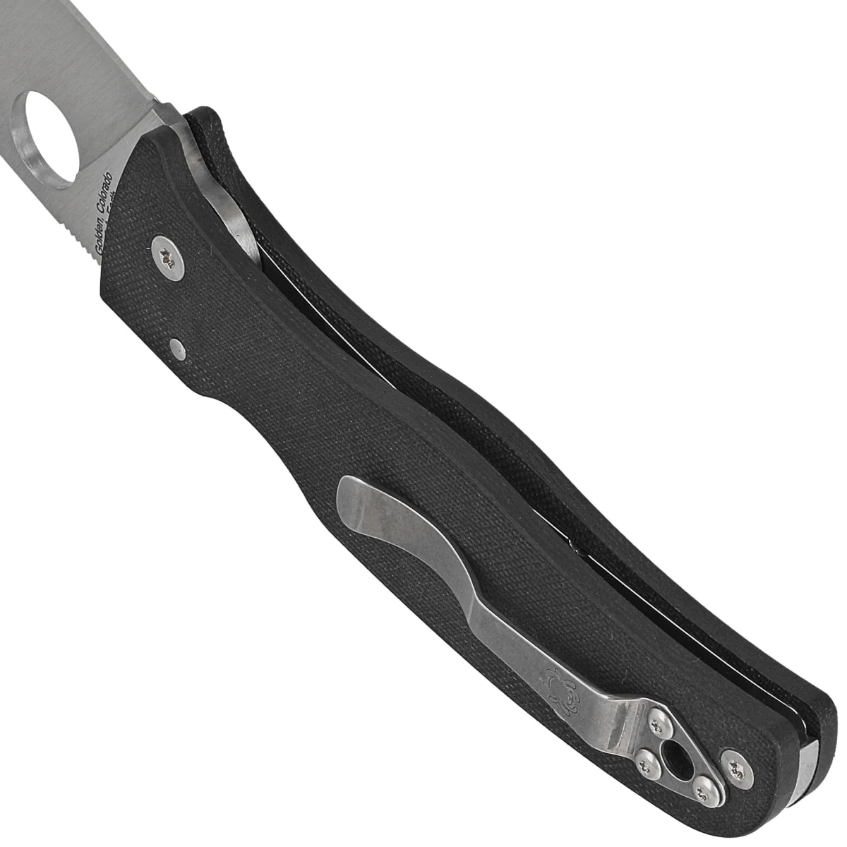 Głownia - szeroka, w kształcie liścia Leaf Shaped, z powiększonym 14 mm wycięciem SpyderHole (patent Spyderco) umożliwiający szybkie otwarcie noża również w rękawicy, rampa pod kciuk z nacięciami (spine jimping) pomaga kontrolować duże ostrze. Ostrze gładkie Plain w połączeniu z płaskim szlifem (Flat Grind) daje doskonałą geometrię krawędzi tnącej oraz ekstremalną wydajność cięcia.