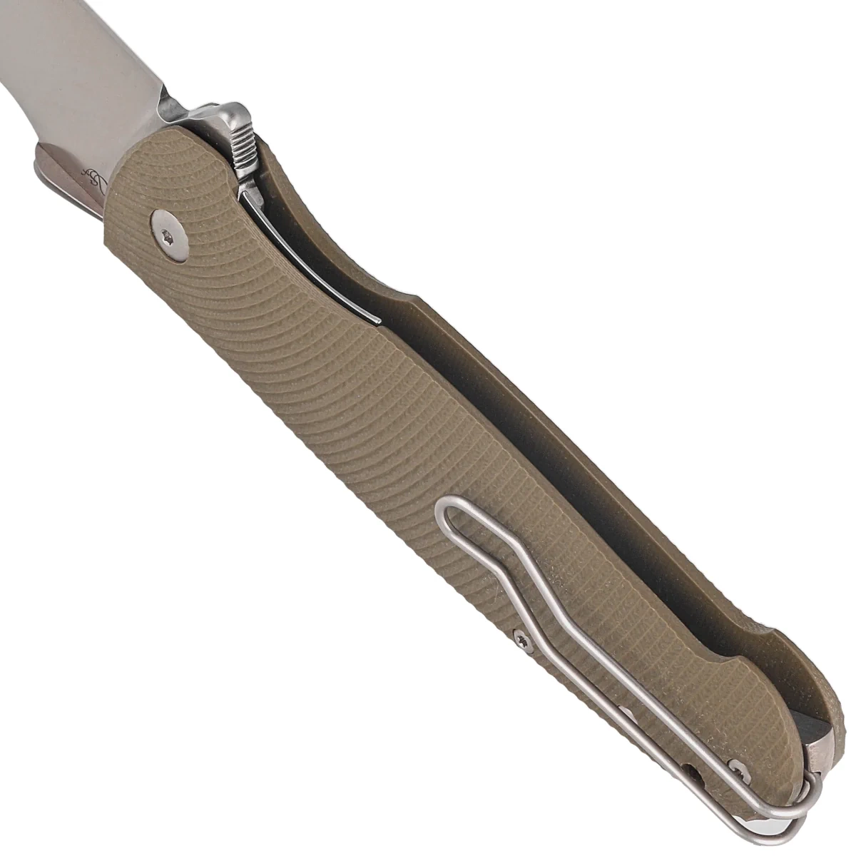 Rękojeść - wykonana z tworzywa G-10, praktycznie niezniszczalnego tworzywa, niewrażliwego na warunki atmosferyczne, odpornego na chemikalia i uszkodzenia mechaniczne, frezowana faktura na powierzchni dla poprawienia pewności uchwytu. Okładki przykręcono do tytanowego backspacera, dzięki czemu uzyskano praktycznie niezniszczalność takiej konstrukcji. Prawostronny, głęboki klips deep carry, pozwala przenosić dyskretnie nóż w pozycji tip-up (czubkiem ostrza do góry). Na końcu rękojeści lanyard hole, otwór na linkę.