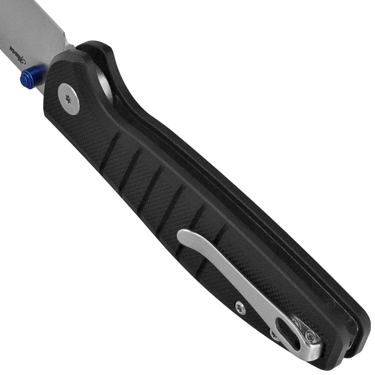 Rękojeść - wykonana z G10, praktycznie niezniszczalnego tworzywa niewrażliwego na warunki atmosferyczne, odpornego na chemikalia i uszkodzenia mechaniczne. Agresywna tekstura okładzina zapewnia pewny chwyt, nawet mokrymi dłońmi. Fazowane krawędzie okładek eliminują ostre krawędzie dla wygody, a wykonany z przodu podcięcie na palec poprawia ergonomię. Otwarta konstrukcja tzw. open-backed mocowana stalowymi tulejami dystansowymi redukuję wagę oraz ułatwia czyszczenie. Dwupozycyjny, prawo/lewostronny klips deep carry pozwala przenosić dyskretnie nóż w kieszeni w pozycji tip-up (czubkiem ostrza ku górze).